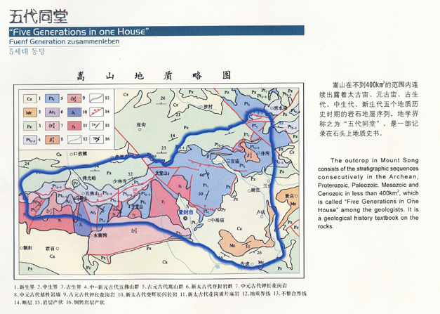 嵩山世界地质公园位于河南省登封市,地处华北古陆南缘。在公园范围内,连续完整地出露35亿年以来太古代、元古代、古生代、中生代和新生代五个地质历史时期的地层,地层层序清楚,构造形迹典型,被地质界称为“五代同堂”,实际上是一部完整的地球历史石头书。