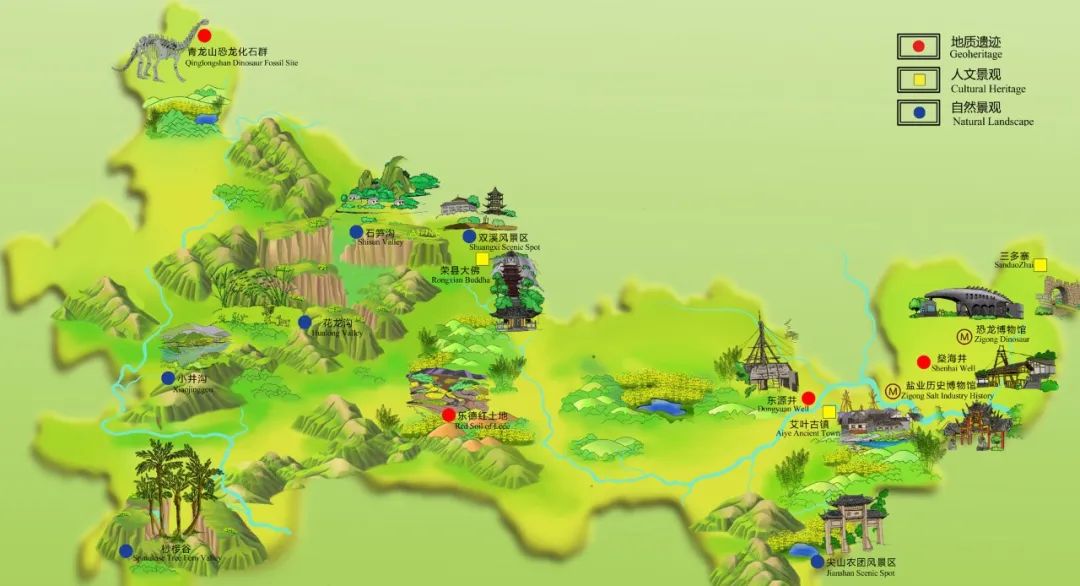 自贡世界地质公园位于四川省,公园以中侏罗世恐龙化石遗迹和井盐遗址为特色,辅以桫植物群落。地质遗迹由大山铺恐龙化石群、燊海井、东源井、凉高山长岭巨型硅化木、青龙山恐龙化石群、贡井平桥瀑布、乐德红土地等核心遗址构成。
