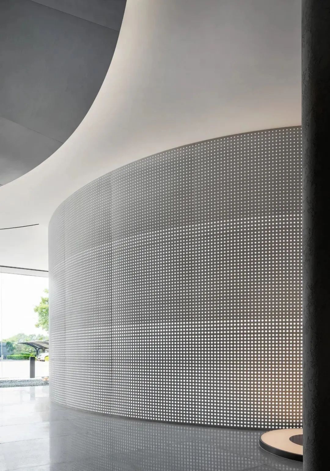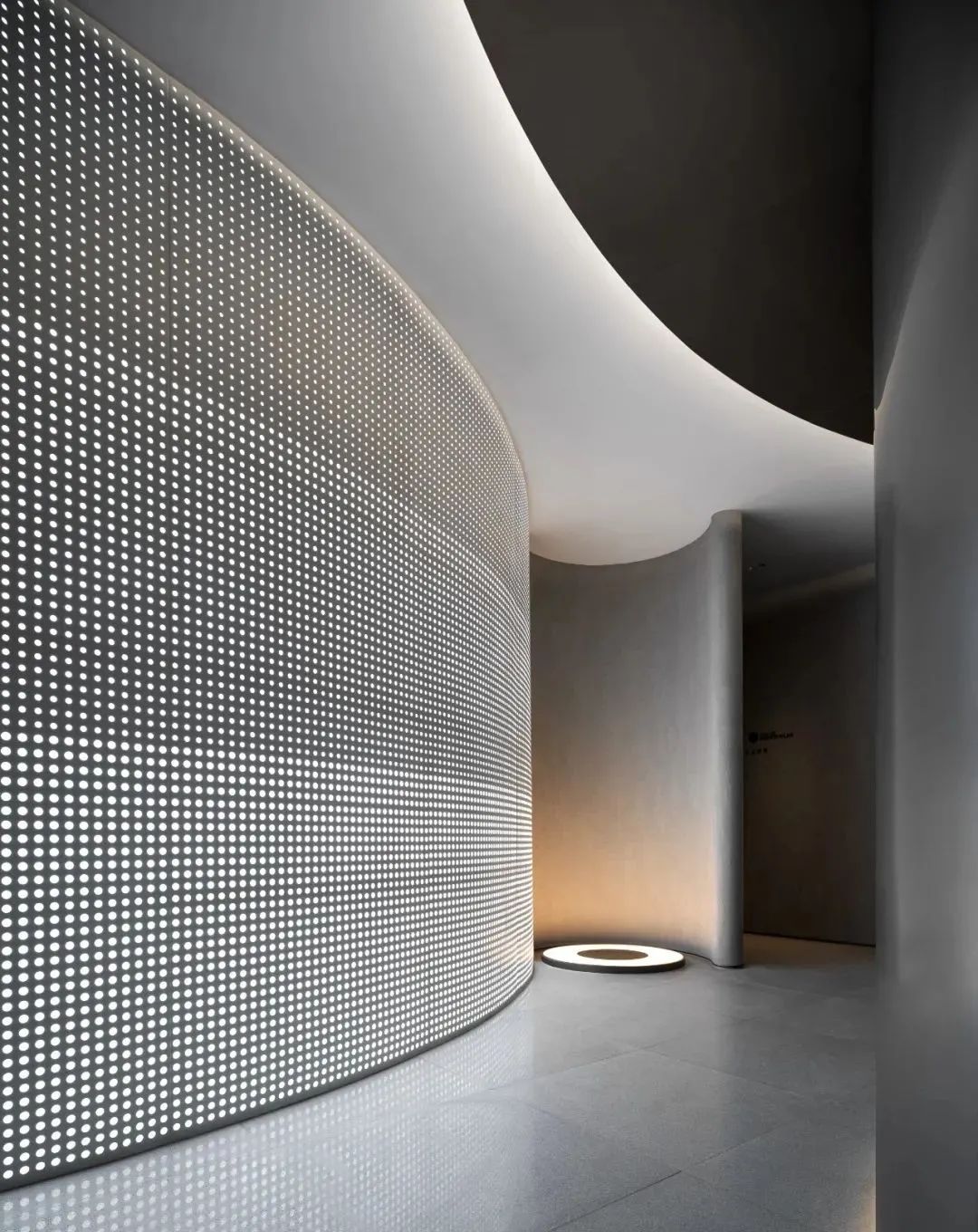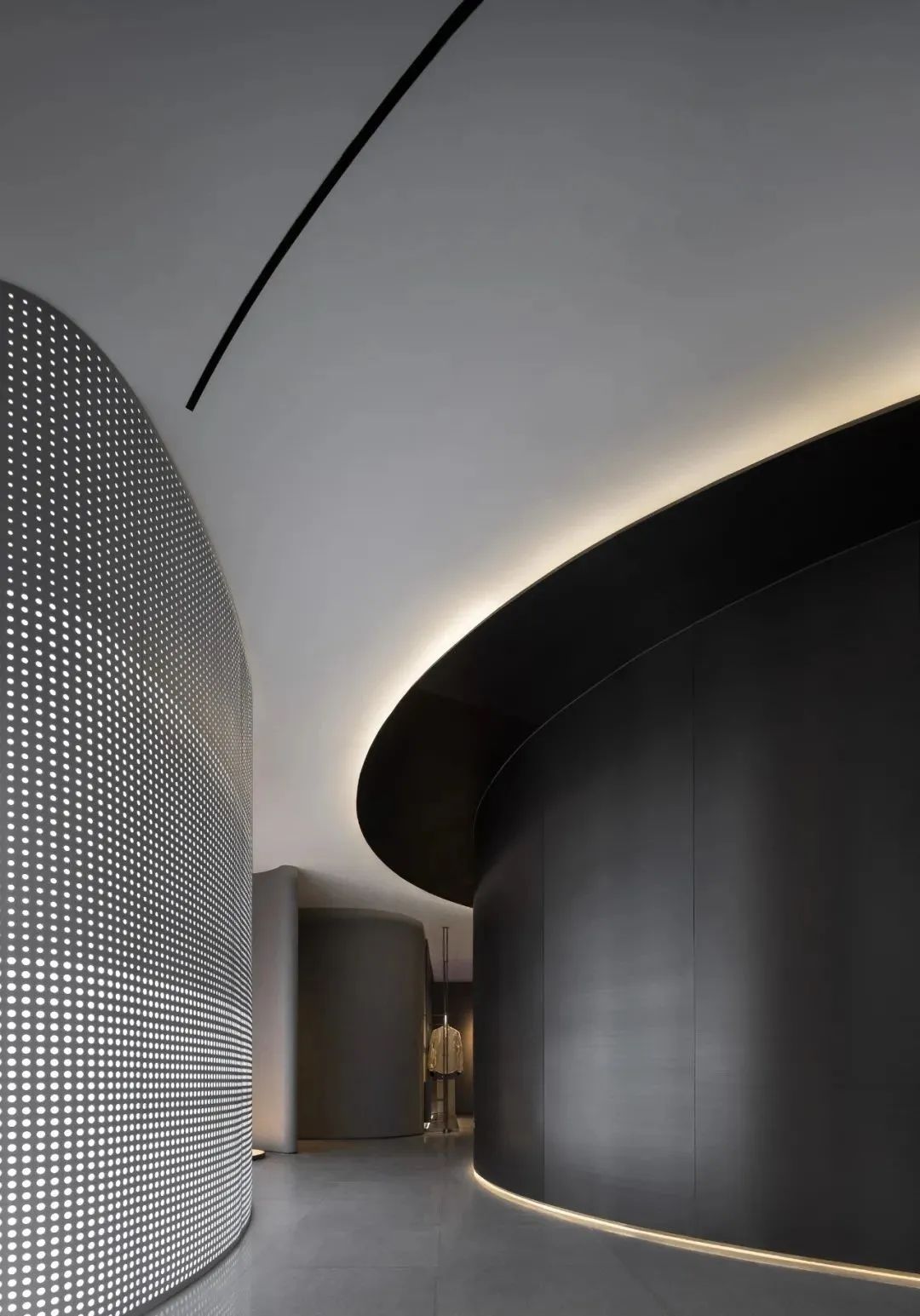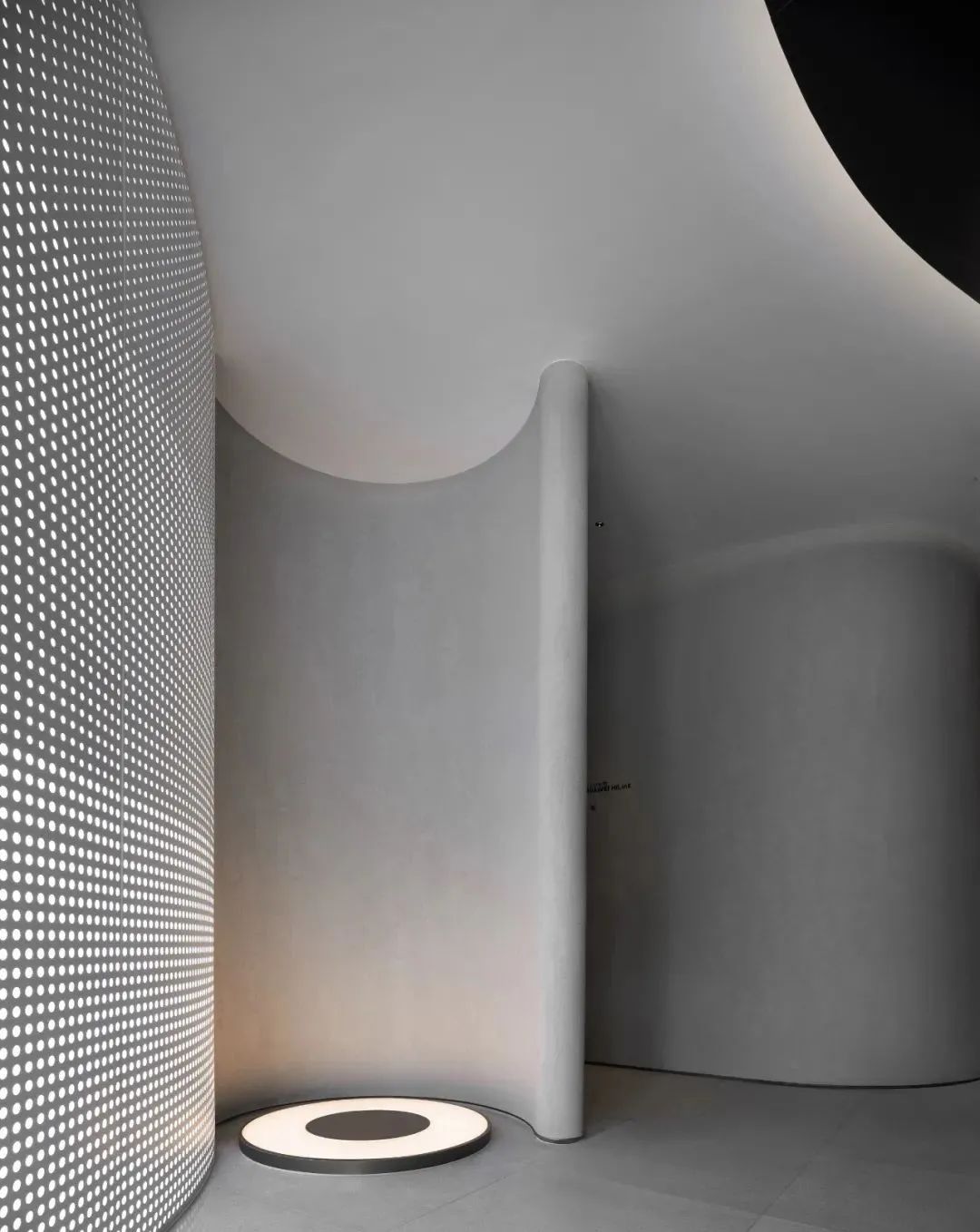 空间结构的最外层通过全金属外壳包裹,利用灯光指引的叠进关系,在空间结构编排上重组了景观、外立面和室内的边界关系,模糊分界线,构造一个以圆点向周围扩散、连接的层次关系,延伸到以柔性材料为中心点的环形灯光演示区域,从而引导体验者从了解产品的过程中最终沉浸在一个由外到内递进的感官体验中。