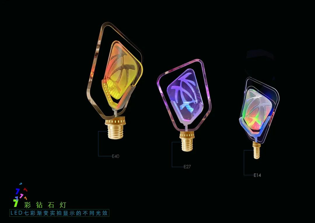 该设计源于钻石切割线,利用导光膜也能切割发光的原理,可做出类似钻石折射反光的效果。发光单元以钻石切割法切割配以发光图案,我们把钻石切割的发光单元类比成灯泡的替代品,外围配套以不同造型的灯罩,组合成灯。此次外围灯罩设计以类似钻石切割镜面不锈钢,和发光单元相呼应,不同角度整合,整组灯可达到全方位大小钻石的既视感。