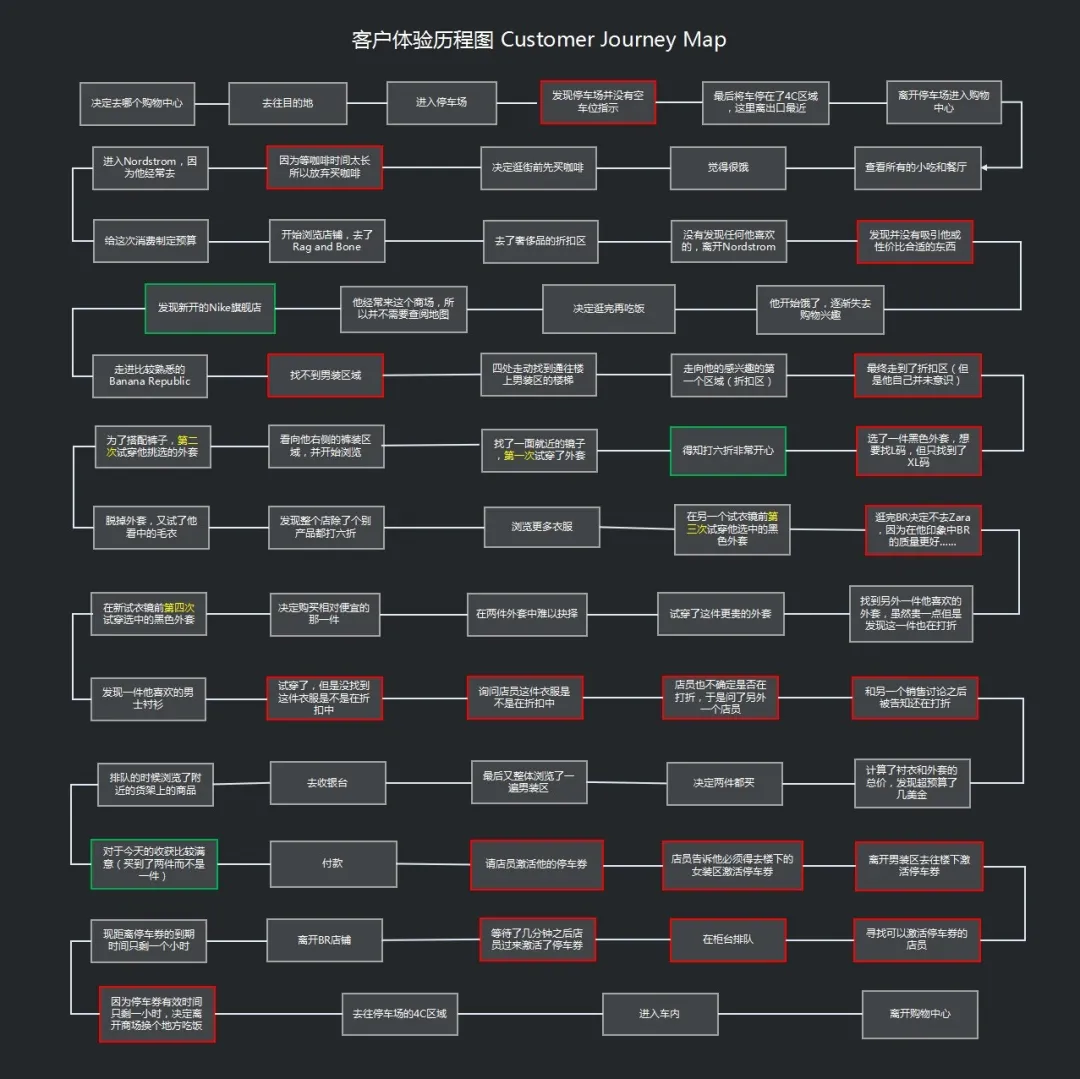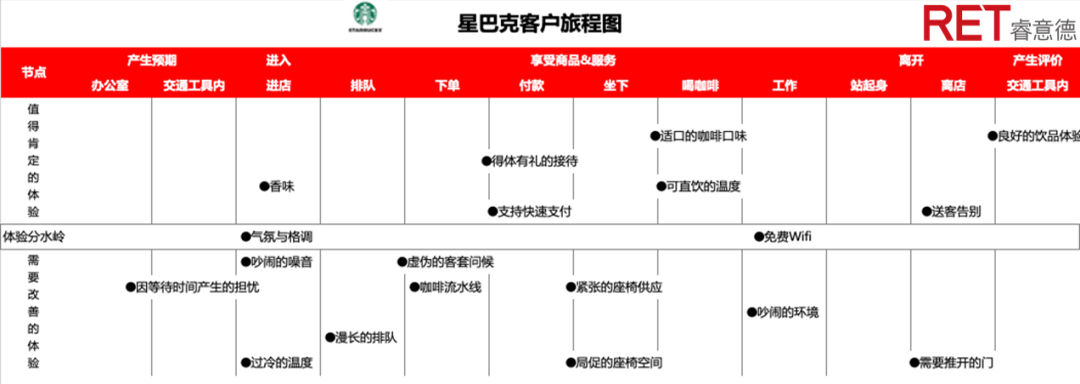 星巴克客户旅程图,将客户产生喝咖啡的想法开始一直到离店的全商品&服务触点一览无余,在每个节点上星巴克都展开了颇具独到之处的优化方法,将客户体验管理的理念发挥的淋漓尽致。