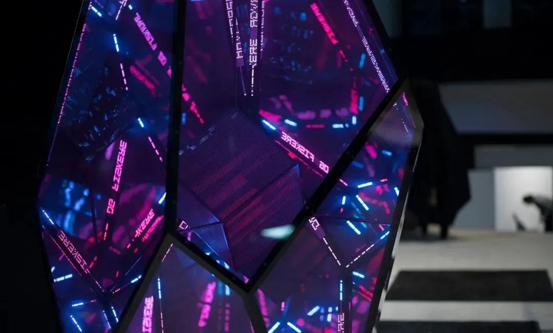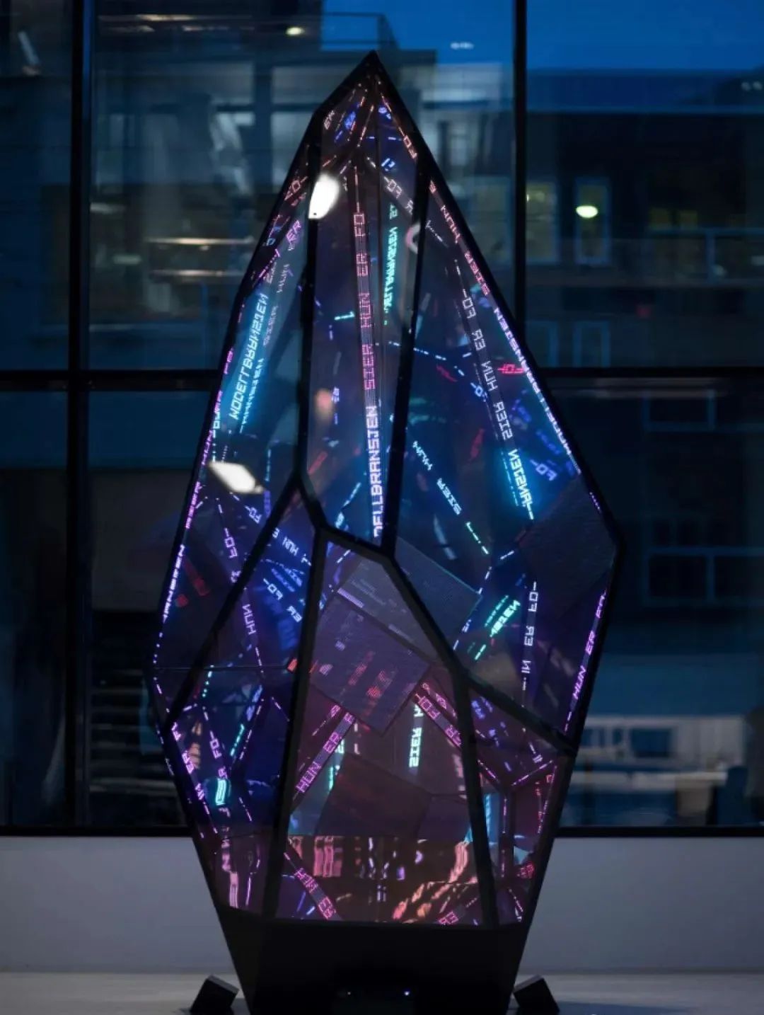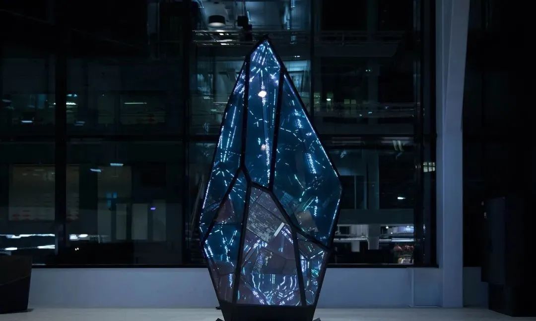 在无人交流的情况下,这块水晶可从当日媒体/新闻中获取灵感,并在”核心“中以图像的形式显示,而无尽循环的几何镜面结构为文字内容。