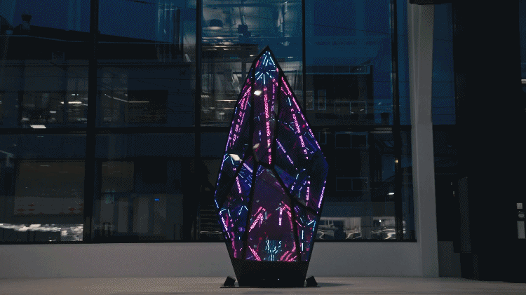 魔法水晶底部用黑色混凝土浇铸,上面为钢结构。内部由 LED 面板和几何结构的 LED 灯条组装而成。该结构覆盖着有色有机玻璃和半透明的反光箔,起到单向镜的作用,有效地创造出无限重复的内容模式。