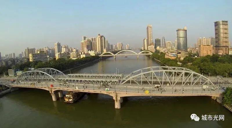 海珠桥:海珠桥,建于1933年,位于海珠、越秀两区交界,解放桥、江湾桥之间,曾是连接广州河南河北的唯一通道。珠海桥全长356.67米,主桥全长182.90米,南北两跨对称布置,原为三孔下承式简支钢桁架桥,设计荷载为二列10吨汽车,中跨为开启式结构,能向上分开,以利大船通过。