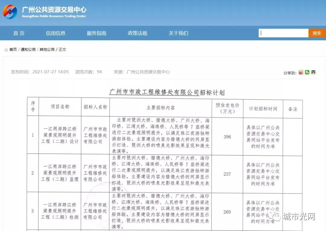 7月27日,从广州公共资源交易中心可查询,广州市市政工程维修处有限公司招标计划包含广州一江两岸跨江桥梁景观照明提升工程(二期)监理和设计。