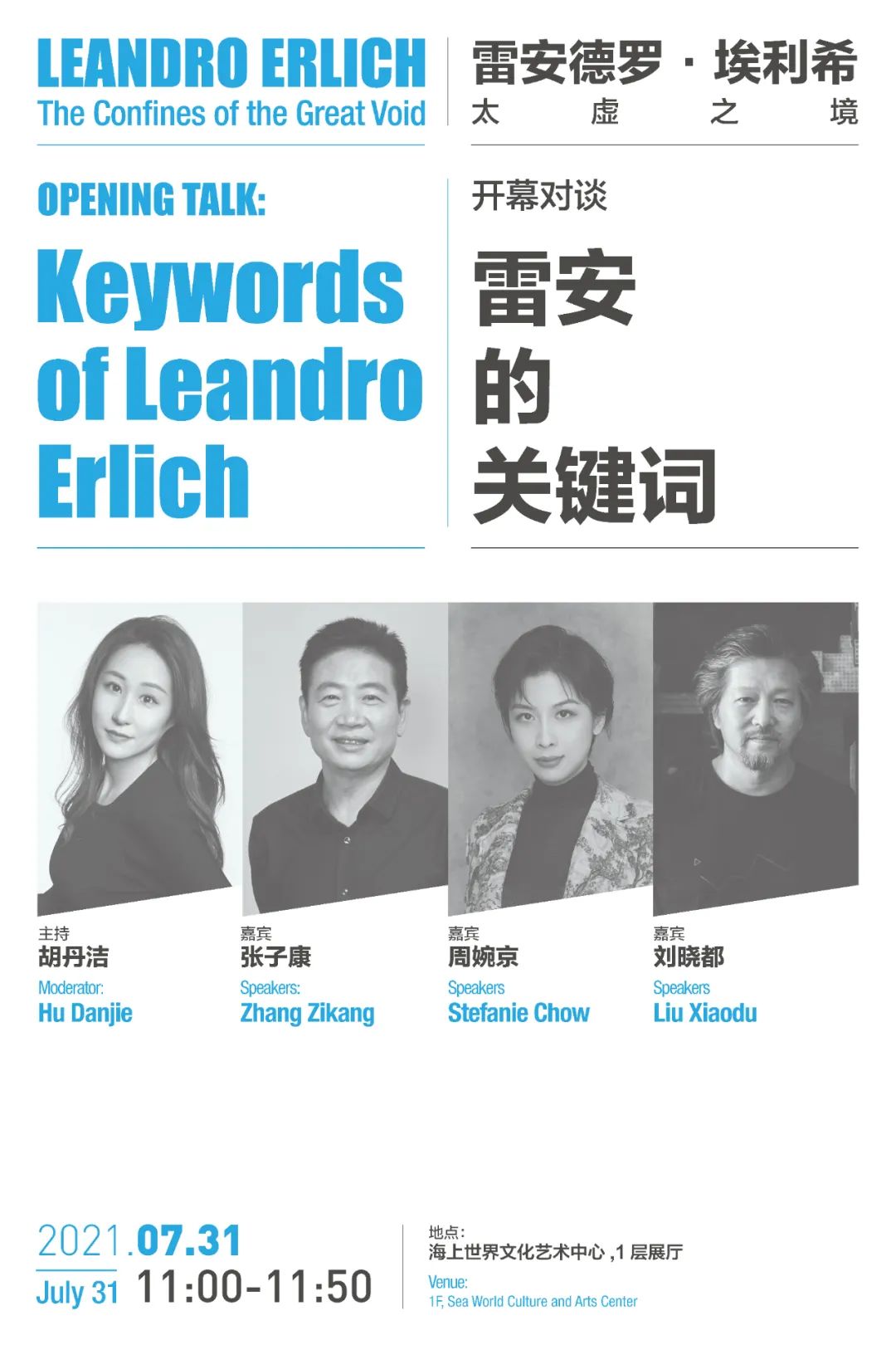 开幕对谈《太虚之境——雷安的关键词》由展览执行策展人胡丹洁主持,邀请到中央美术学院美术馆馆长兼此次展览策展人张子康、作家周婉京、URBANUS都市实践建筑设计事务所创建合伙人刘晓都三位嘉宾。将从雷安德罗·埃利希艺术中涉及的四组关联性概念出发,尝试为观众解开雷安德罗·埃利希在展览现场布下的数个谜团: