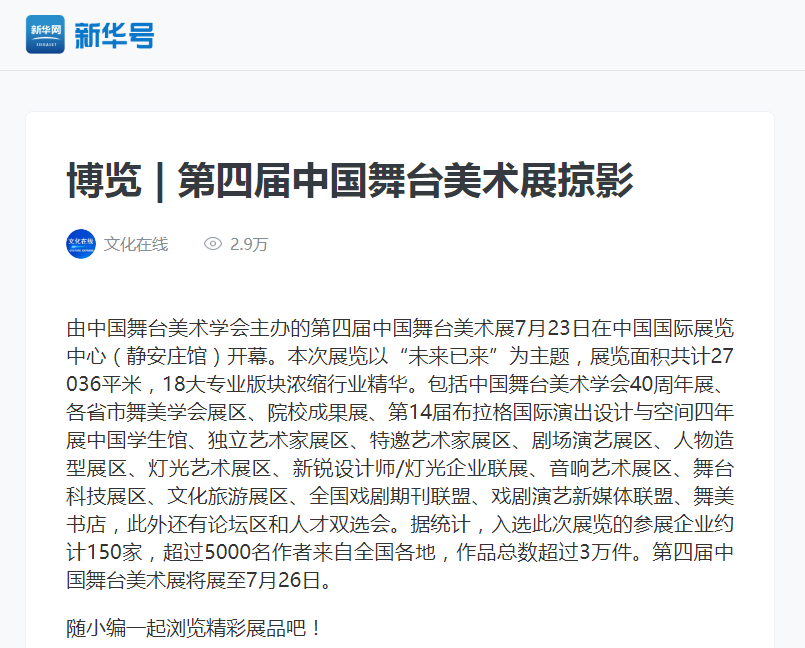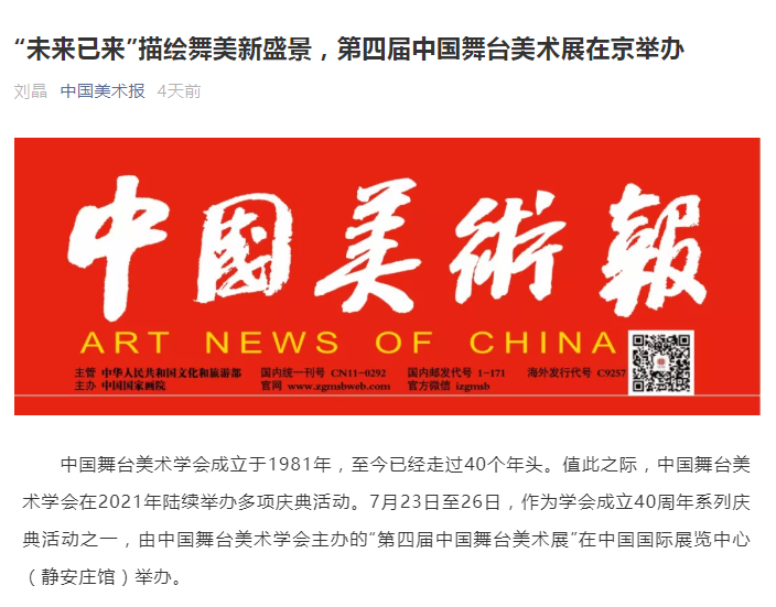 由中国舞台美术学会主办的第四届中国舞台美术展,26日在中国国际展览中心(静安庄馆)闭幕。此展以前所未有的艺术视角打造了一场联动全国舞美行业力量的节日盛会,不仅为中国舞台美术学会成立四十周年画上浓墨重彩的一笔,也探索着中国舞台美术未来的新方向、新模式、新方案。连日来,“四届展”引发了观众们持续的关注,央视新闻、新华网、中国艺术报等媒体相继推出专题报道。