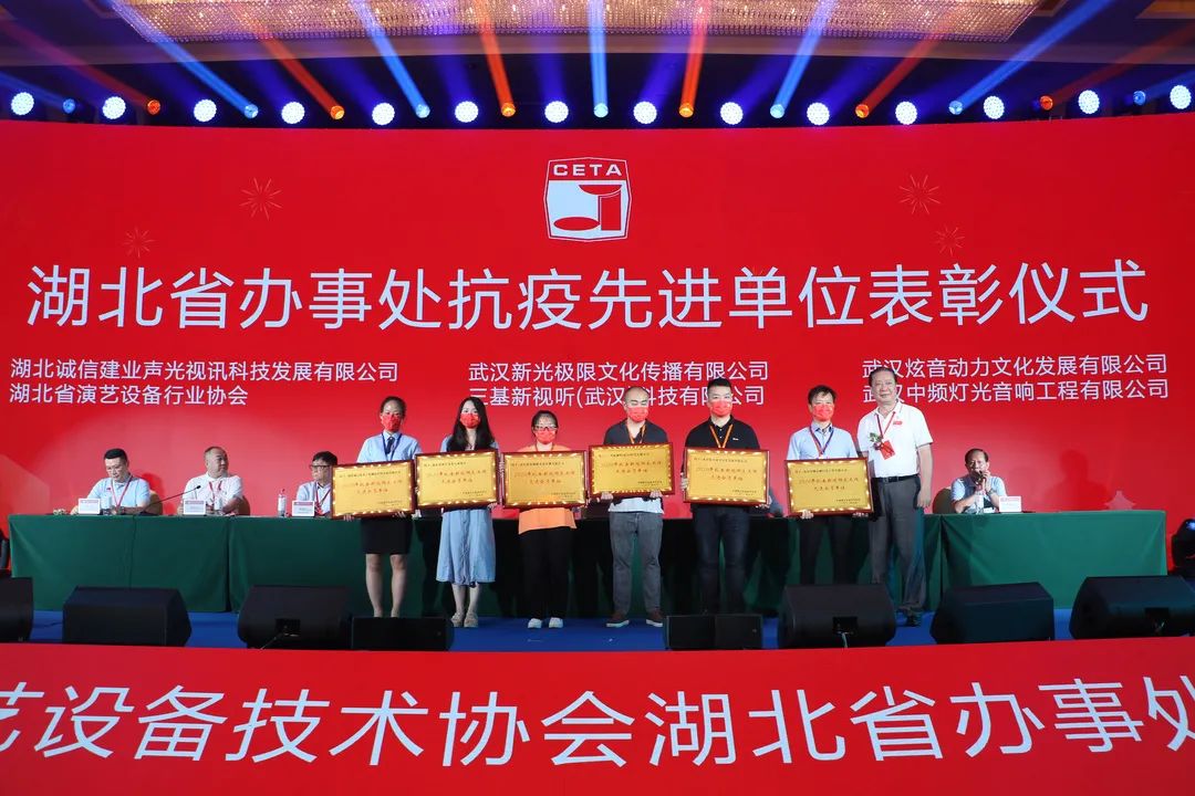 主持人向与会人员简要介绍了湖北诚信建业声光视讯科技发展有限公司、湖北省演艺设备行业协会、武汉新光极限文化传播有限公司、三基新视听(武汉)科技有限公司、武汉炫音动力文化发展有限公司、武汉中频音响灯光工程有限公司等6家单位的抗疫事迹。
