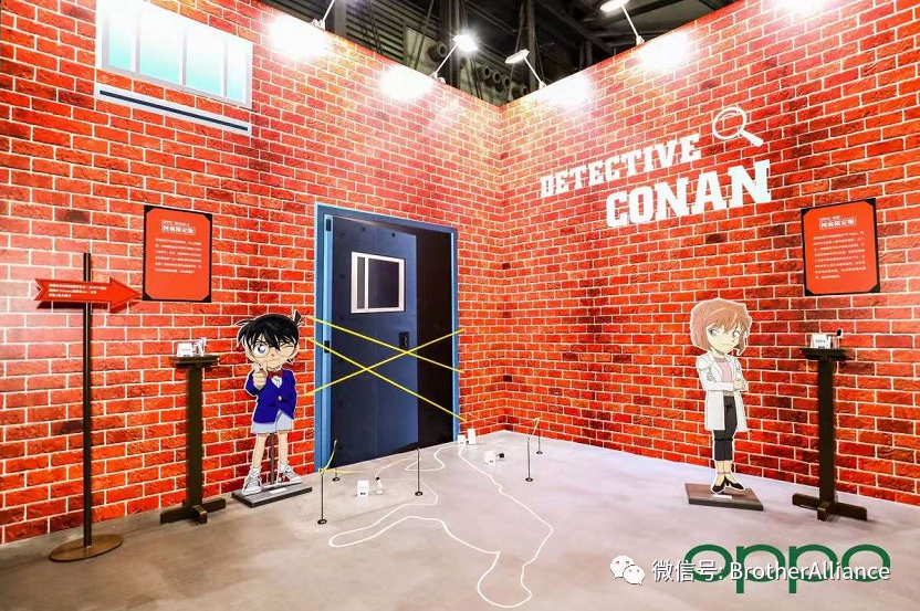 OPPO在ChinaJoy展会现场以《名侦探柯南》、《英雄联盟》两大重磅 IP为灵感布置,现场俨然一个大型玩具厂一般。在柯南专区中,OPPO柯南办案现场,就连新一、柯南、小兰和怪盗基德的大幅人形展板也处处皆是.