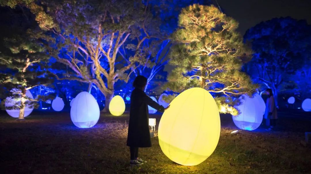光的ovoid如果被人按下或被风吹倒,就会一边站起来一边改变光的颜色,发出颜色特有的音色。周围的ovoid和树木也相继呼应,变化成同样的颜色,发出音色,变化着。