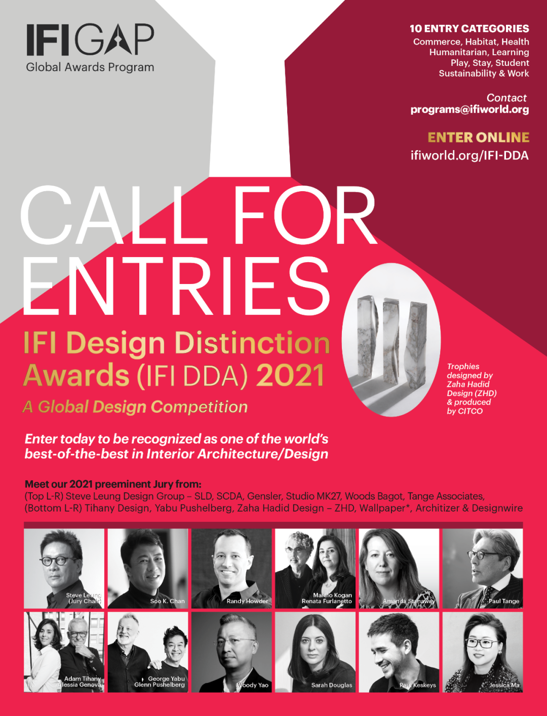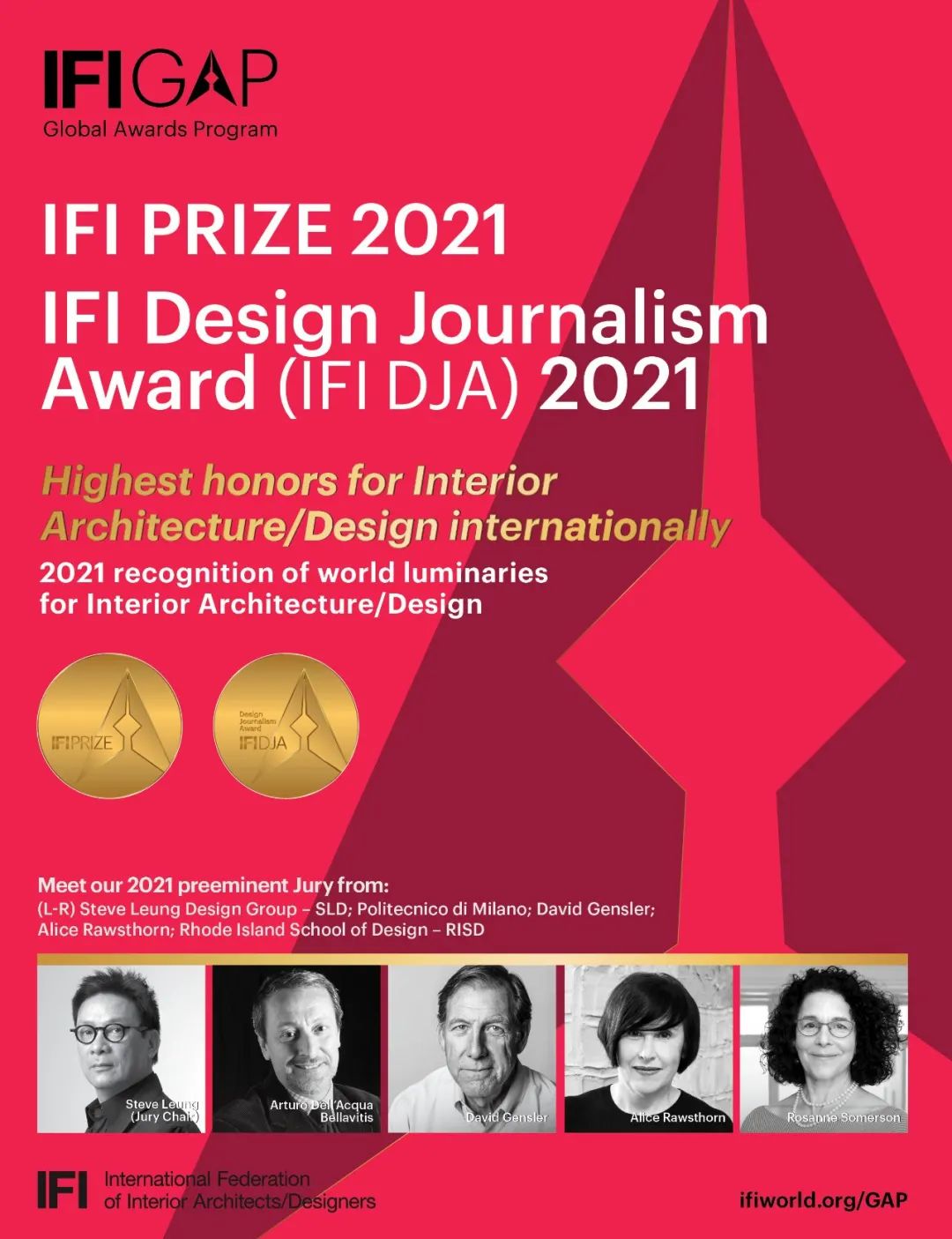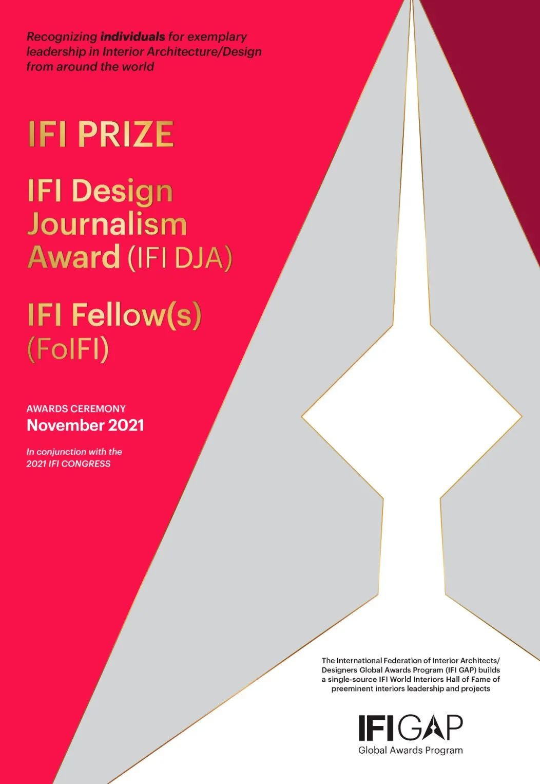 IFI GAP由IFI大奖(IFI PRIZE)、设计新闻奖(IFI DJA)、同业贡献奖(FoIFI)、IFI卓越设计大奖(IFI DDA)荣誉组成,表彰全球室内建筑/设计领域最杰出贡献者及最优雅设计作品。