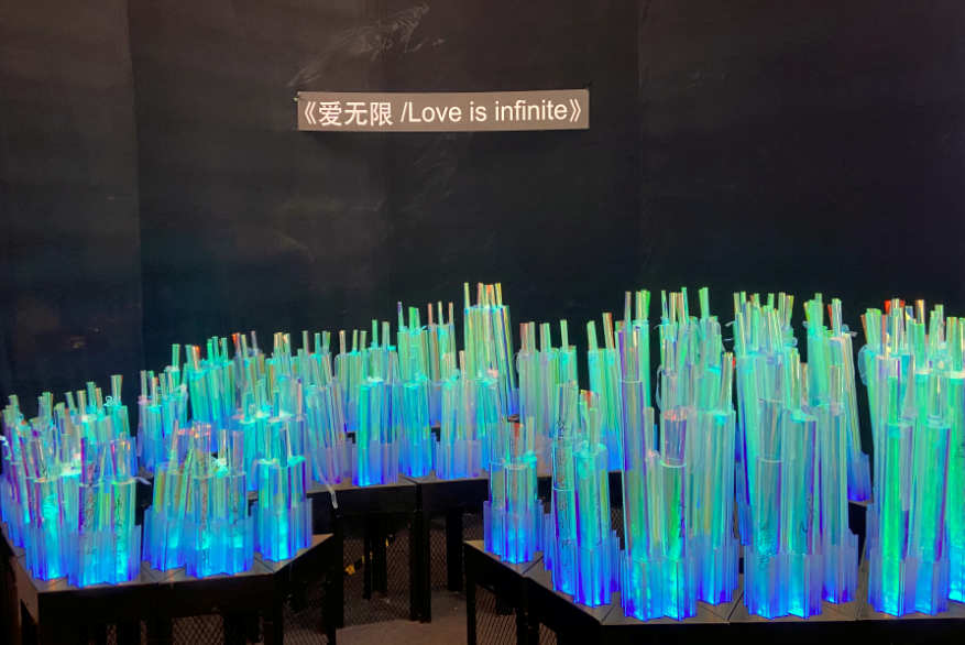 《爱无限 is infinite》是曲国军老师以数学无限符号“∞”为创意,设计的一种爱的表达。作品利用蜂巢结构拼接模组,组成数学无限符号“∞”,装入各种形式祝福的透明瓶子插入每个“蜂巢”,触发点亮装置,高频率的艺术电能,在光影与色彩下的变化下为城市增添律动。