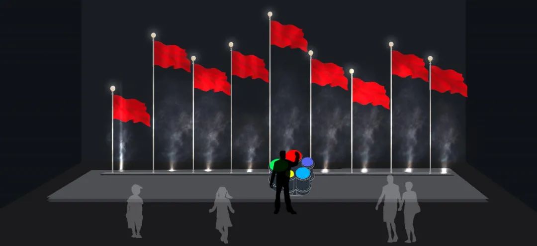 灵感由来:以旌旗为设计元素,寓意胜利的号角,传递喜悦的信号!本装置运用尚乐自主研发的智能AI互动系统,敲击鼓发出音律。利用智能传感系统将声、光、电、乐、雾、风等多种元素融合实现可控可编的舞美装置效果。