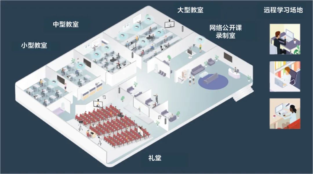 天花板吸顶安装的自动声向追踪麦克风可以实现完全无接触的声音捕捉,并通过现场的音响系统进行语音增强,在消除物理接触、降低感染风险的同时仍然可以保证教室本地和网络远端的学生清晰地听到老师的声音。