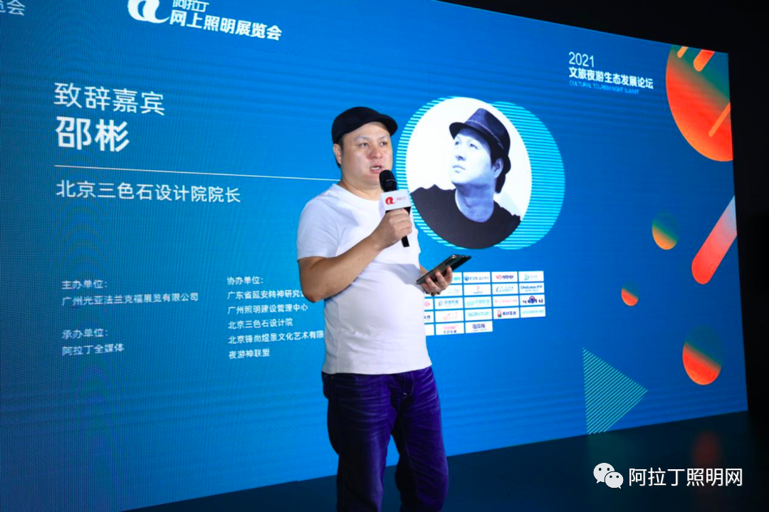 同时,协办方代表北京三色石设计院院长邵彬上台致辞,他对到场的嘉宾与观众朋友致以由衷的感谢,表示今年适逢中国共产党成立百年,正是红色文化旅游迅速升温的新契机,为了营造更加优质的红色旅游文化氛围,灯光照明也将面临更加严格且多样化的服务需求。希望借助本次论坛活动,与大家共同探讨红色旅游夜经济的未来发展,把握好时代新契机、新趋势,挖掘红色旅游新形态,开拓文旅夜游新空间。