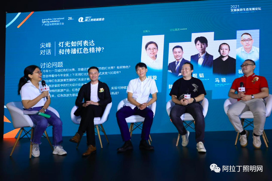 嘉宾的精彩分享后,迎来了上半场论坛的尖峰对话环节。围绕“灯光如何表达和传播红色精神?”中心话题,四位演讲嘉宾就“今年七一百城红色灯光秀现象、 红色旅游演艺里灯光设计的重要性、红色旅游如何可持续性发展”等话题展开深入探讨,干货满满!