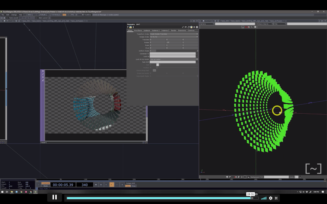 你将能够使用常用的TouchDesigner基础元件,从零开始创建生成几何体,并进行实时三维渲染。完成如下图的作品: