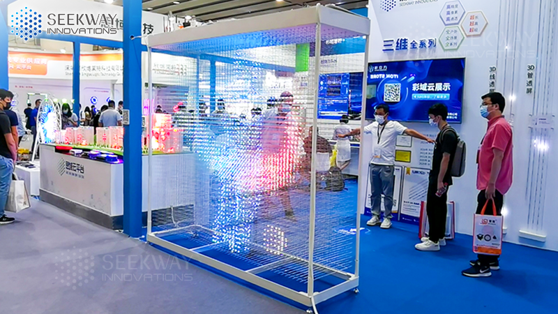 其中,三维区C位的3D互动装置吸引了不少观众驻足停留。观众通过体感识别、手机发送指令与装置交互,感受美轮美奂的视听盛宴。作为获得2020年阿拉丁神灯奖最佳产品奖的产品,已在许多国家及地区创造了经典的光影作品。