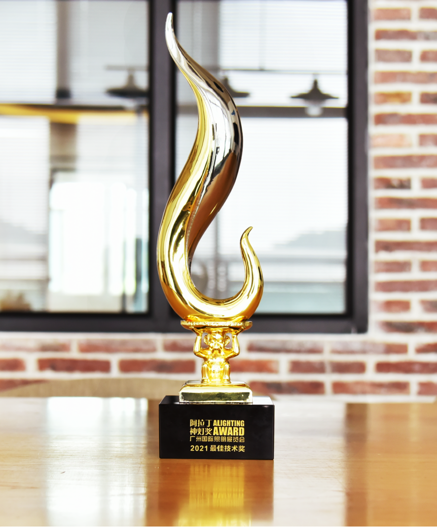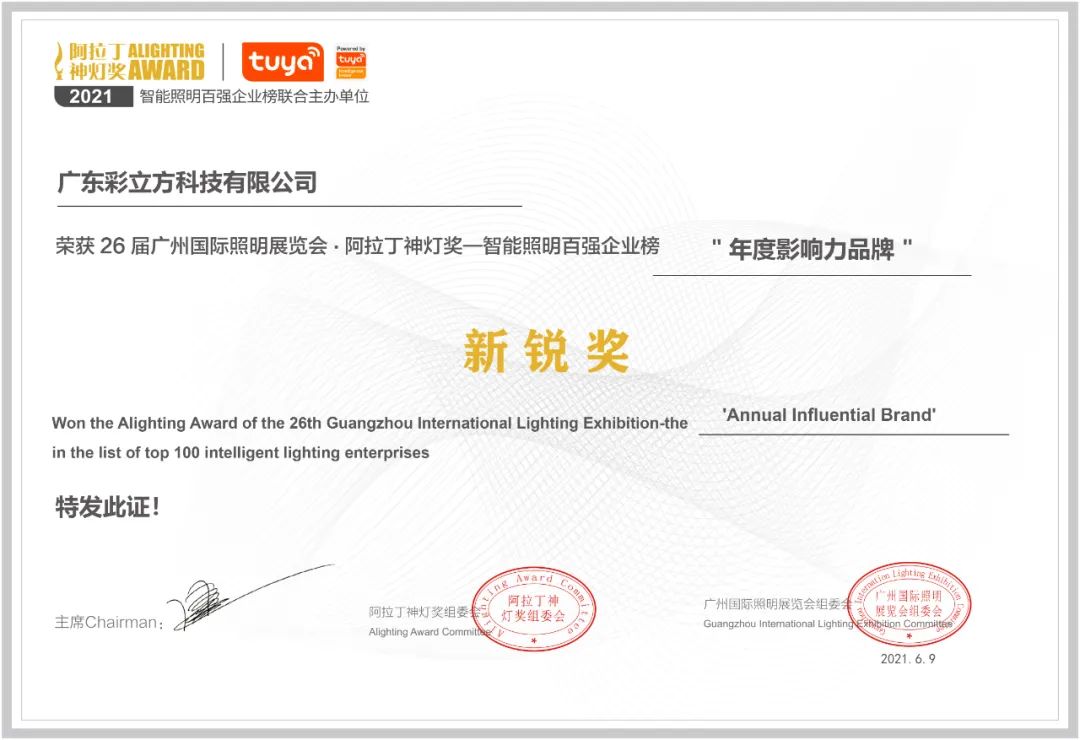 在光亚展同期举办的2021第九届阿拉丁神灯奖颁奖典礼上,我司荣获四项大奖:彩立方获智能照明百强企业年度影响力品牌奖,3D超长管获优秀产品奖,线透屏获优秀产品奖,思域科技的智能云电箱获最佳技术奖。