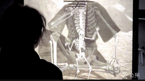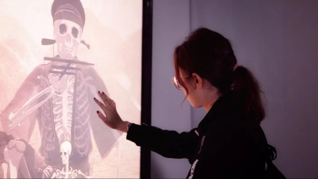 新媒体艺术装置《骷髅幻戏图》,让大小骷髅从团扇中走到了现代屏幕前与观众互动。戴幞头、着色衣的大骷髅用丝线牵动小骷髅,含死之意;小骷髅看似被操控,实则主导命运,带生之欲。
