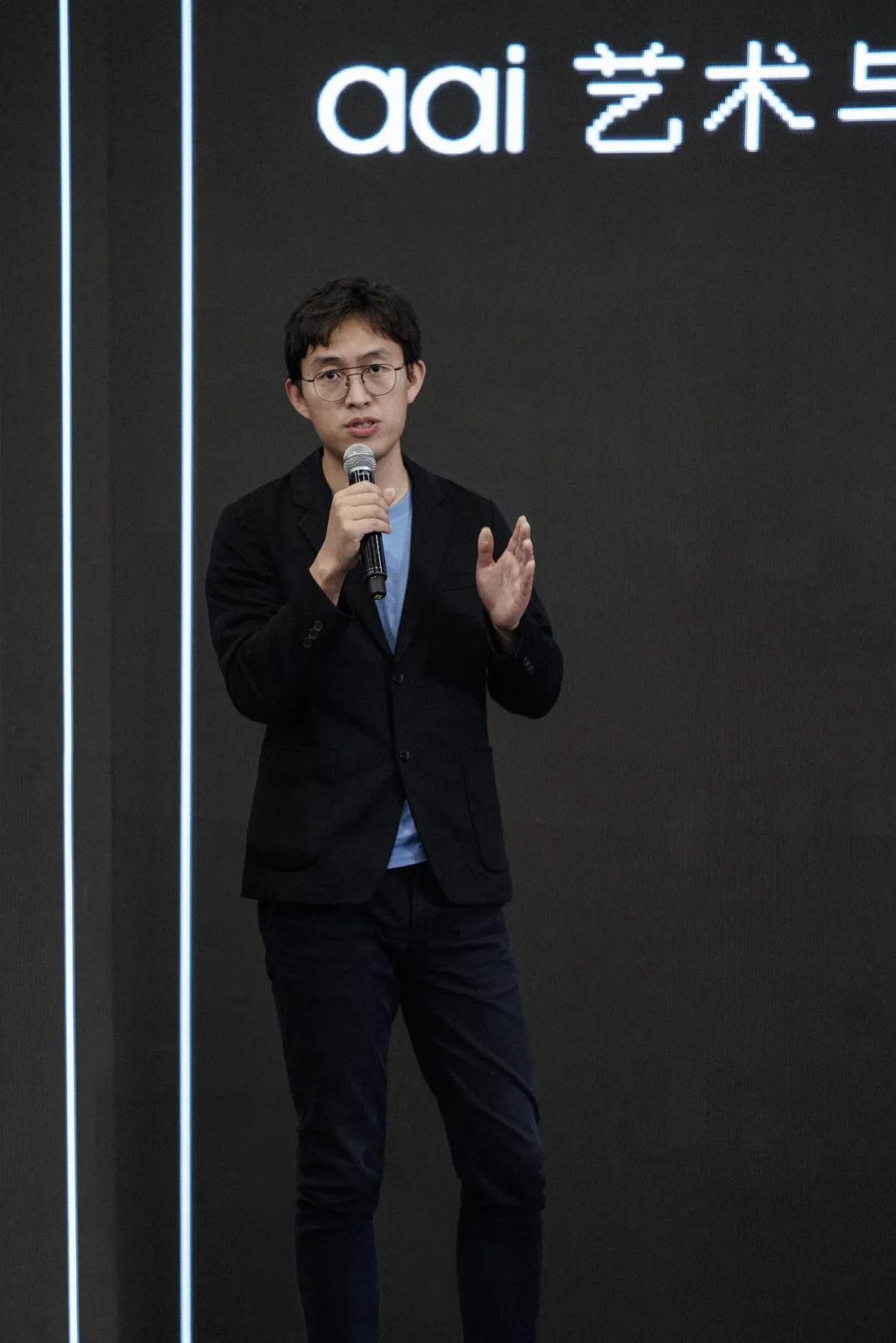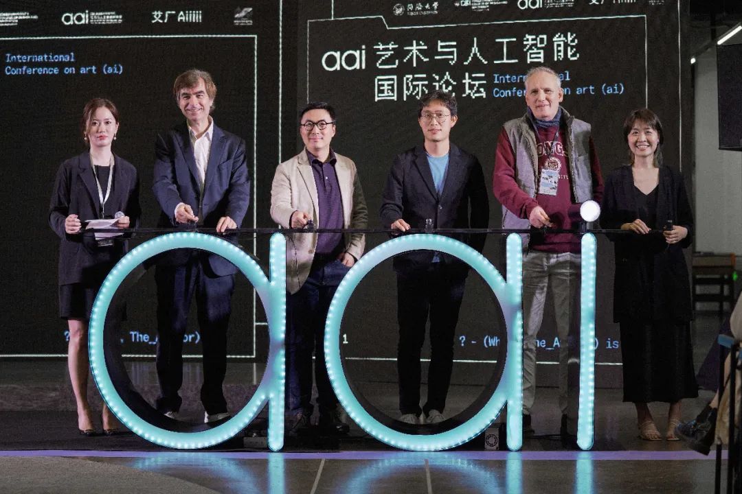 aai实验室还举行了简短而富有创意的亮灯仪式。同济大学副校长兼设计创意学院院长娄永琪教授(左三)作为嘉宾,与实验室发起人张周捷(右三)、Filippo Fabrocini教授(右二)、Kostas Terzidis教授(左二)以及艾厂人工智能艺术中心负责人李茜(右一),艾厂人工智能艺术中心首席营销官朱玲(左1)在学者、艺术家、媒体代表和师生们的共同见证下,共同登台并按下按钮,点亮了代表实验室LOGO的艺术装置aai,aai实验室也由此宣告正式成立。