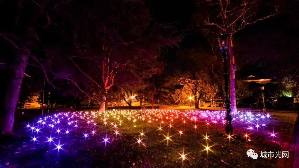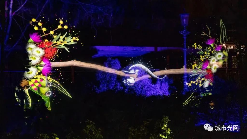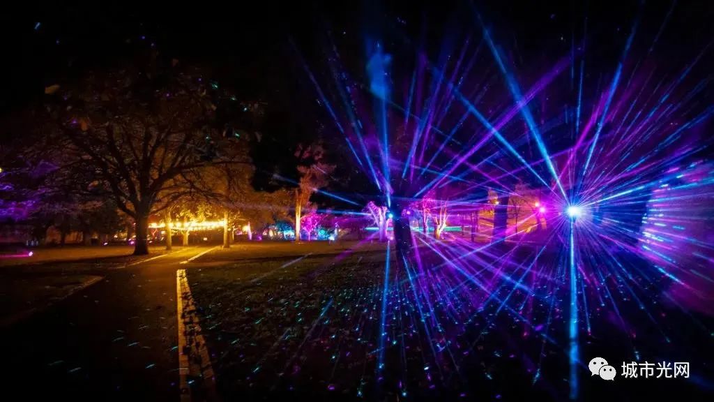 本迪戈(Bendigo)是澳大利亚维多利亚州第四大城市。在华人心目中,本迪戈被称为“大金山”,与墨尔本“新金山”以及美国的圣弗朗西斯科“旧金山”齐名。这个充满活力的,位于澳大利亚维多利亚州中部的小城,不仅孕育了当地丰富的美食和美酒、更有与其他城市相媲美的艺术和文化产品。这里有维多利亚女王大雕像、亚历山德拉喷泉,威罗纳湖。夜幕下,令人惊叹的历史建筑和花园、标志性景点璀璨耀眼。为了帮助本迪戈尼亚人从有疫情的、忧郁的冬天中醒来,艺术家团队Laservision Mega Media全新打造《Awaken Bendigo》让罗莎琳德公园光芒四射。创作者挖掘公园树木和土著故事,让艺术装置反映本迪戈丰富的历史、悠久的文化。《Awaken Bendigo》吸引了来自本迪戈和周边地区的近80,000人,夜场活动几乎场场爆满。投影、全息图、激光、灯光等特效,让每个装置在灯光、色彩和声音下捕捉本迪戈的故事,以更壮观的、饱满的热情丰富城市的人文历史。其一共有13个艺术装置,包括“国家承认 ”、“传统的拥有者”、“园艺遗产”、“黄金之河”、“大岳山”、“艺术场景”、“郁金香镇”、“植物群与动物群”、“挖掘记忆”、“星光”、“南极光”等。这些装置在充分挖掘在地文化的基础上,利用当地的自然、人文资源优势,唤醒当地人的记忆。Acknowledgement of Country