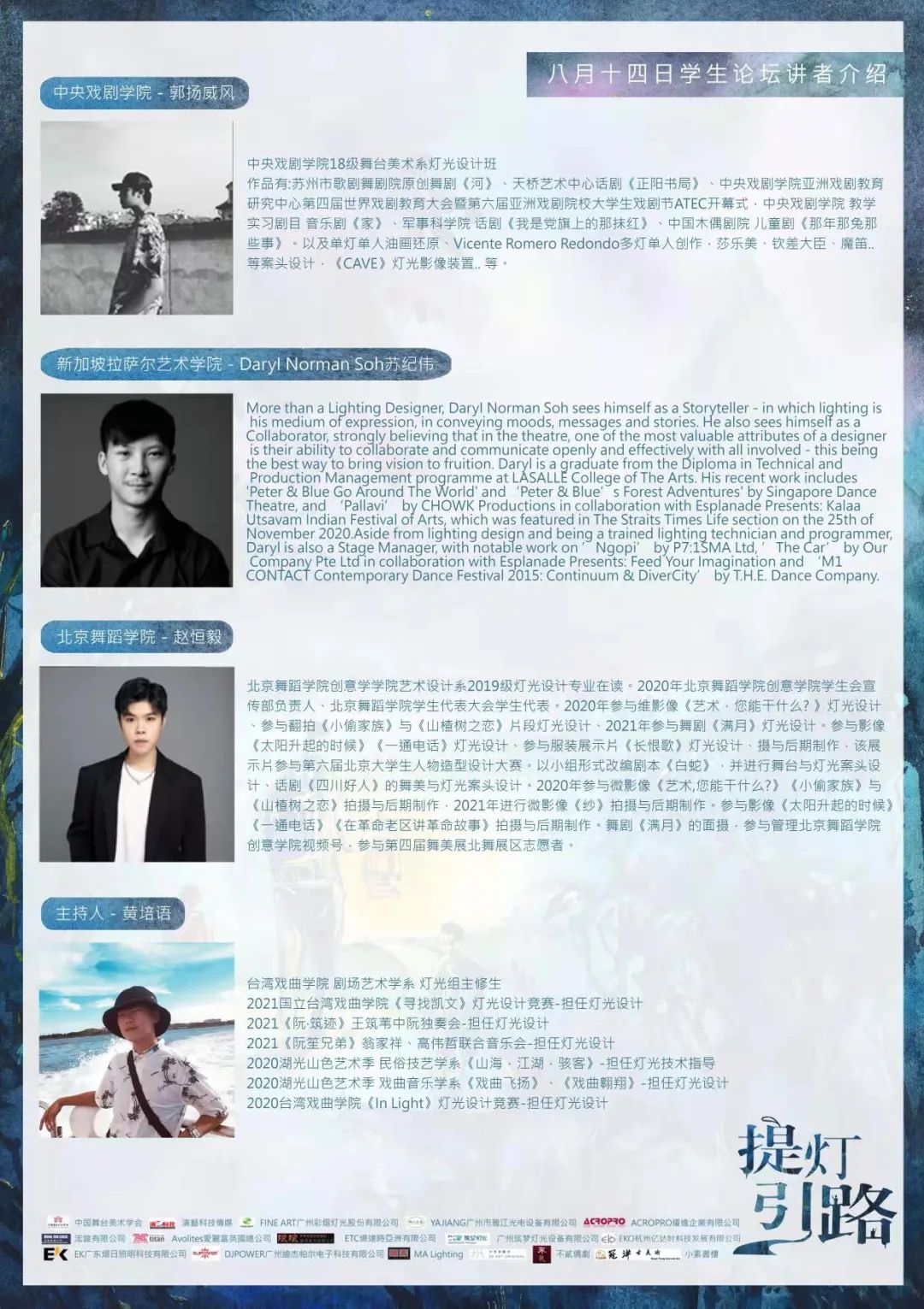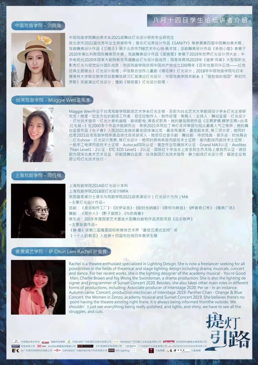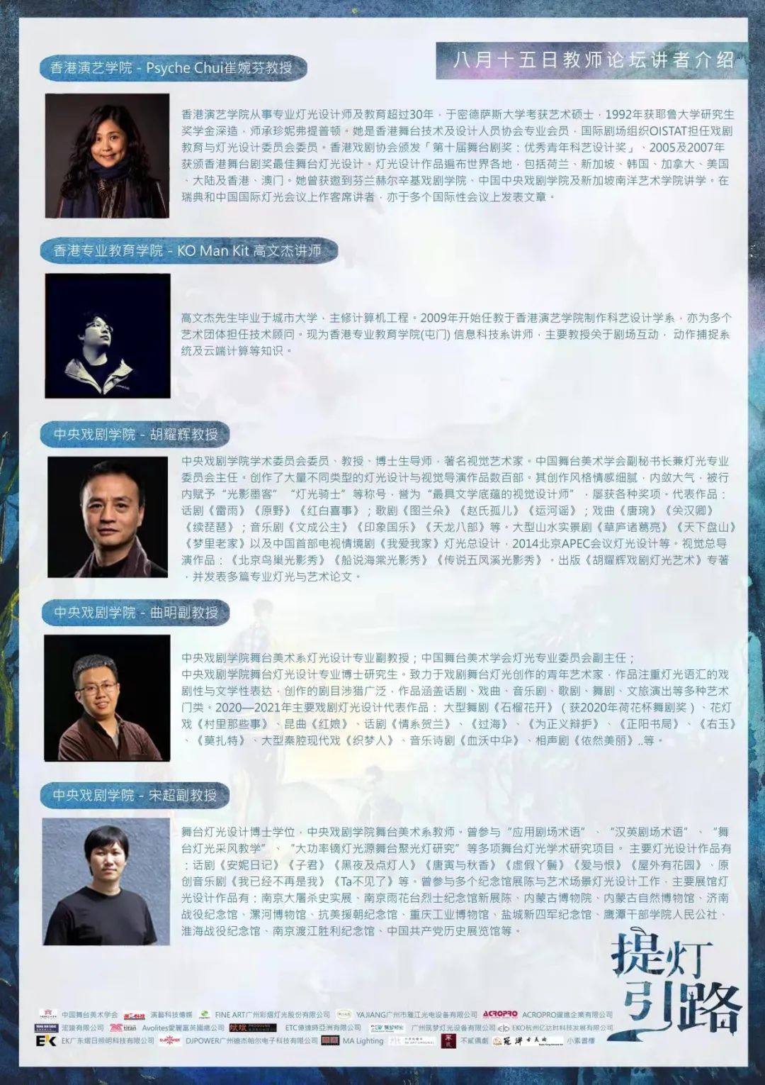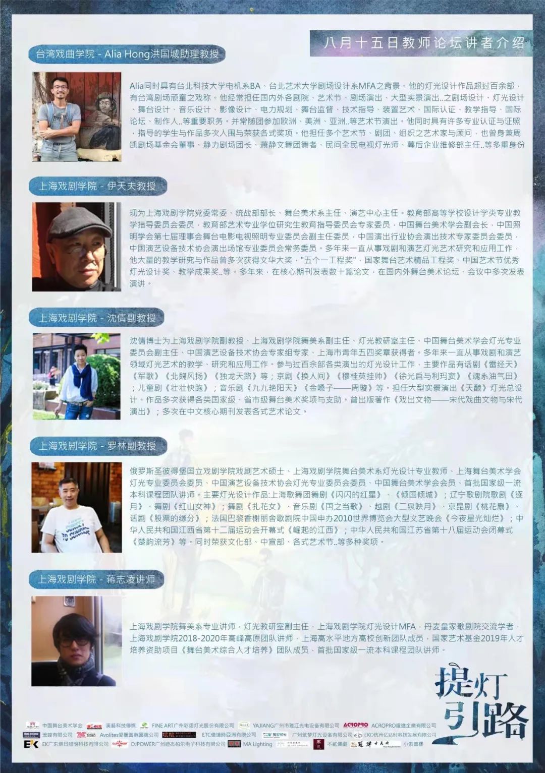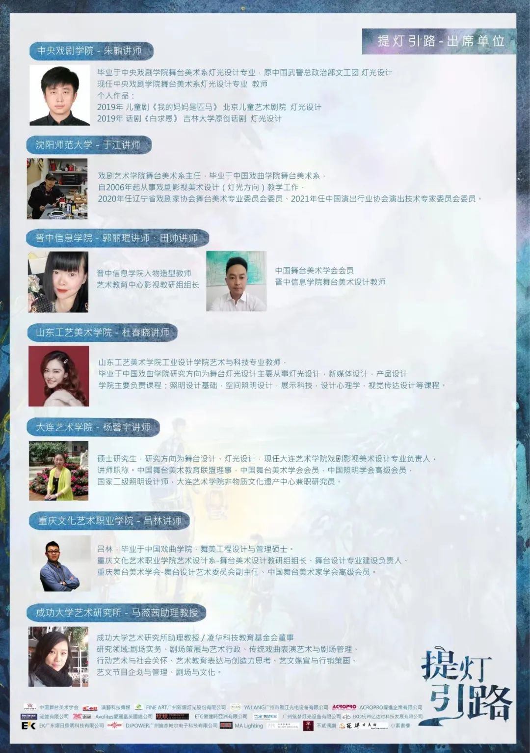 中国舞台美术学会、演艺科技传媒、FINE ART广州彩熠灯光股份有限公司、YAJIANG广州市雅江光电设备有限公司、ACROPRO耀进企业有限公司、浤竣有限公司、Avolites爱丽富英国总公司、斌斌贸易股份有限公司、ETC亿达时亚洲有限公司、EKO杭州亿达时科技发展有限公司、广州筑梦灯光设备有限公司、EK广东熠日照明科技有限公司、DJPOWER广州迪杰帕尔电子科技有限公司、MA Lighting、卅原创艺术、不贰偶剧、冠洋古美术、小素书楼。
