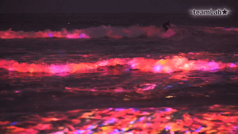 日本创作团队teamLab最近在海边将炫彩投影打在起伏的海浪上,为原本充满活力的冲浪运动赋予艺术美感。