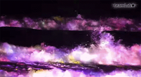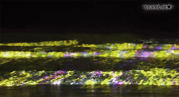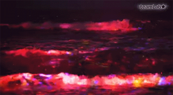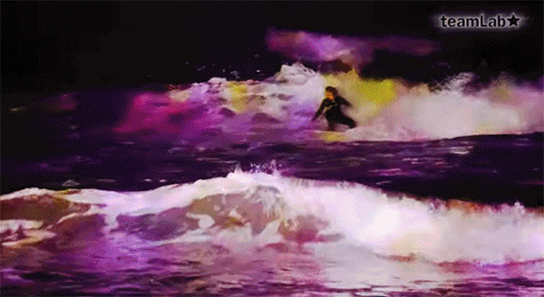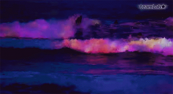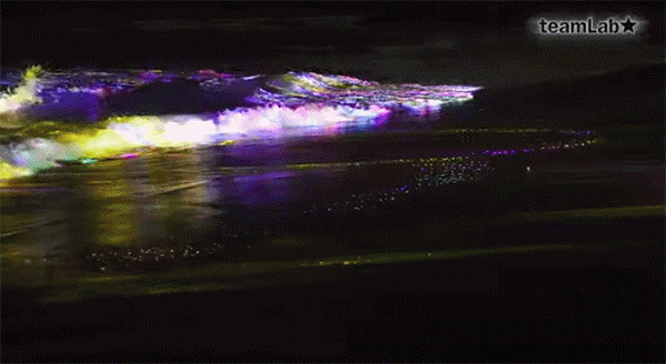 teamLab在海边将炫彩投影打在起伏的海浪上,为原本充满活力的冲浪运动赋予艺术美感。海浪拍打着海滩,泛起阵阵波涛。海浪一浪高过一浪,一浪比一浪有力量,激发出蓬勃、旺盛的生命力,展现出与白天截然不同的一面。