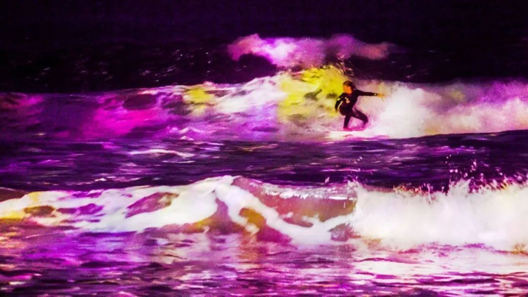 海浪颜色变化多端,当它是金黄色的,好像杰克船长的海底金矿。当它变成紫色的,又像是紫藤花散落一地。当它变成红色的,冲浪者好像站在火烧云上,与海浪共舞。