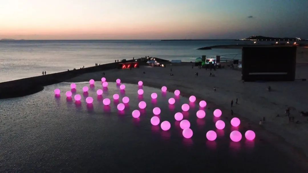 漂浮在海面上的光球明亮地闪烁着,自由地呼吸着,远远望去像气球落在了海里。其采用光的颜色与周围球体发生共振的原理,使球体改变颜色,这些颜色从一个球体不断地共振到另一个球体。当风静止,没有人触碰他们,发光的球体忽明忽暗,漂浮在海面上,如海上舞者,随着音乐自由变换舞姿,优雅又迷人。