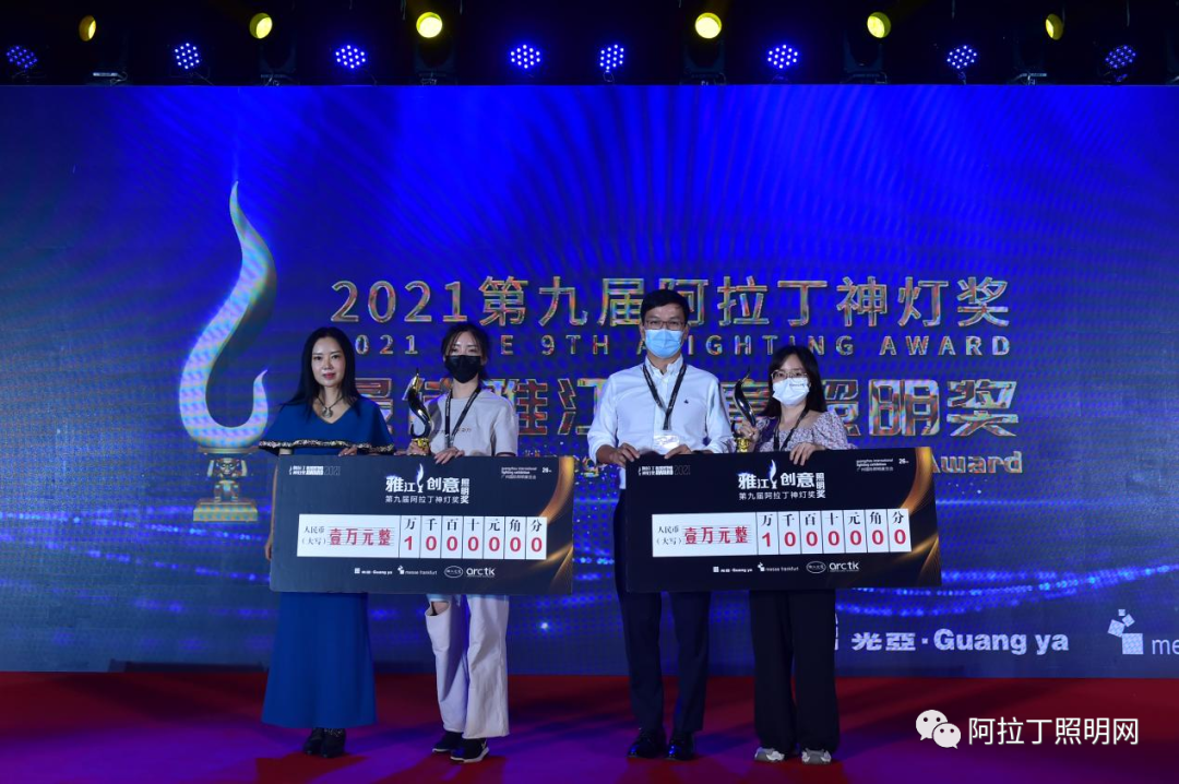 雅江创意照明奖终审委员/上海晓醒照明设计工作室|设计总监初醒悟、雅江创意照明奖终审委员/中国美术学院风景建筑设计研究总院照明中心主任朱剑修、雅江创意照明奖联合主办单位广州市雅江光电设备有限公司文旅景观照明事业部总监卿喆以及中山半导体照明行业协会秘书长涂巧玲为本届“阿拉丁神灯奖--优秀雅江创意照明奖”获奖者颁发获奖证书及奖金。