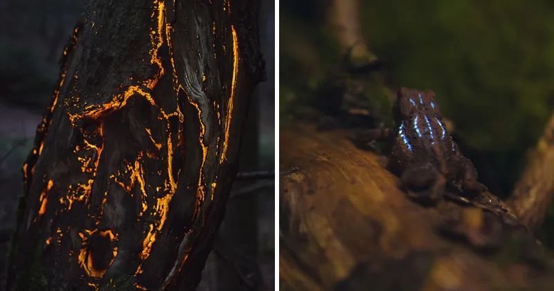 为此,他俩还特地在森林里创作了这件作品“bioluminescent forest”,通过投影机和电脑,和对图片的编辑,改变生物体的颜色和形状,从而得到融合了现代技术和生物体的超现实画面。