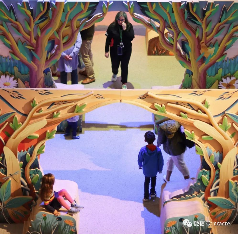 几片彩绘的立体木拱门,结合色彩鲜艳的动物主题插画,营造出多感官的“卡通隧道书”。