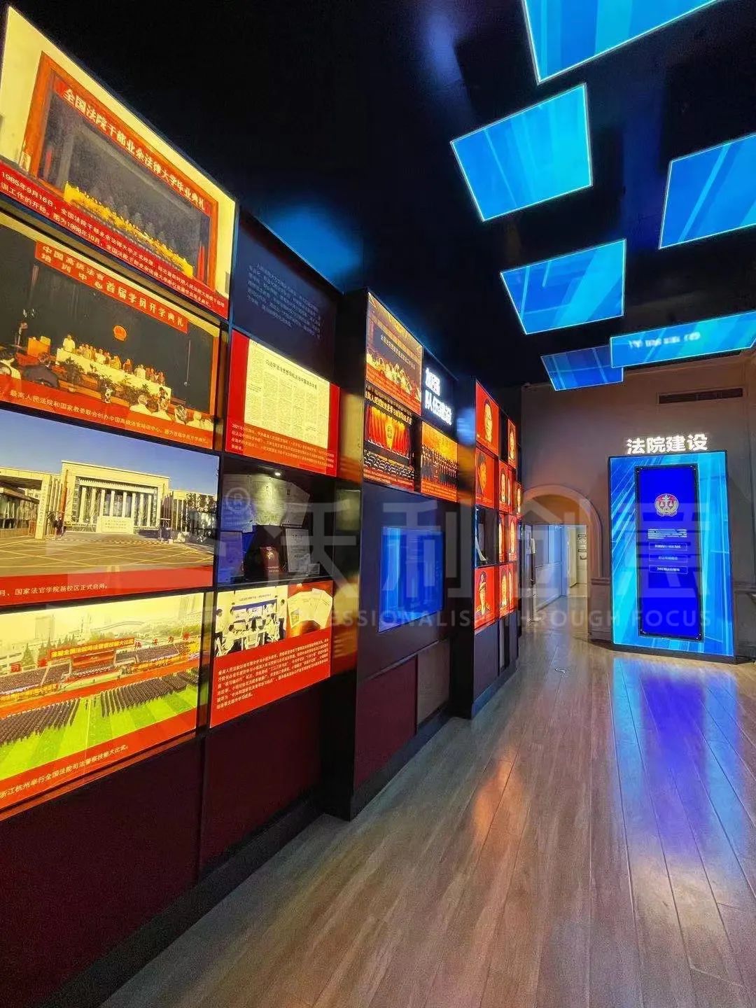 展览分为3个展厅,26个展览单元,以时间为主线,以事件、案例为副线,运用“实物资料+电子视频+触摸互动体验”三位一体的多元展示平台,结合弧幕投影、互动桌面及通电玻璃等多种创新技术,全景式展示了中国共产党领导下的人民审判工作取得的重要成就和宝贵经验,多维度展现了人民司法发展的历史脉络和重大事件。