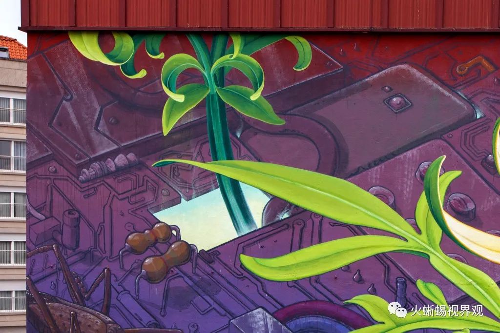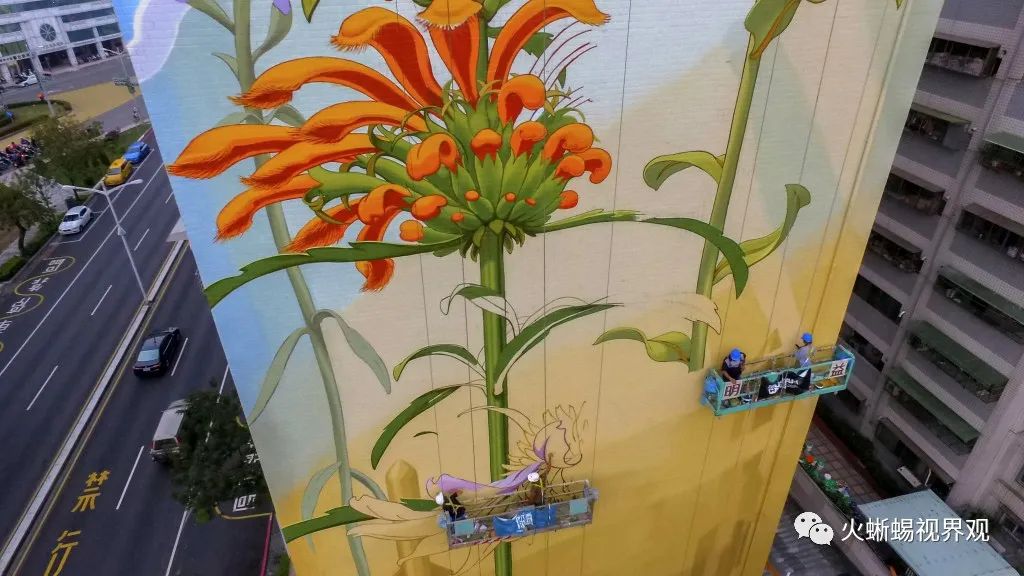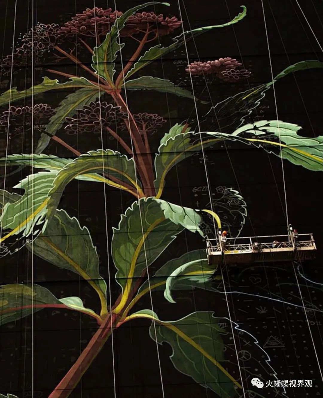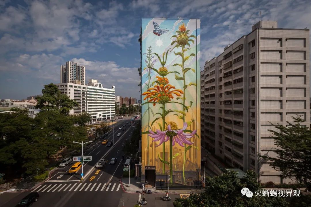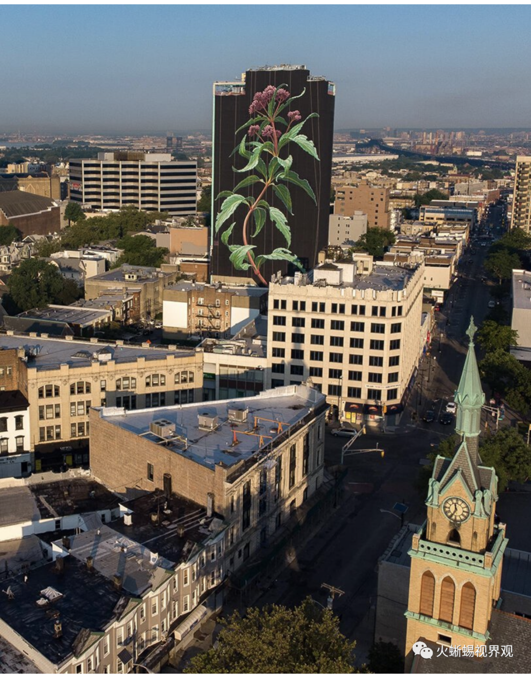 Mona Caron(莫娜·卡隆)最新创作的这幅大型壁画,画的是盛开在美国泽西市大楼外立面上的一朵野花。在一座20层大楼的黑色背景下,一株当地的野生植物-----孤独的斑茎泽兰舞动着不受控制的浓密而尖锐的叶子。