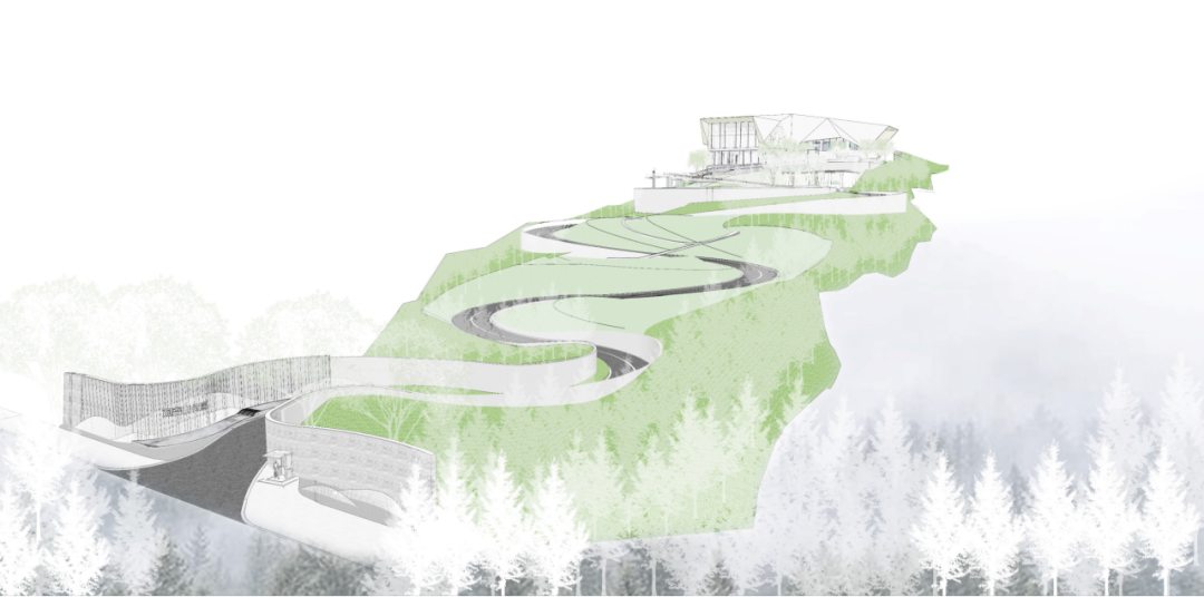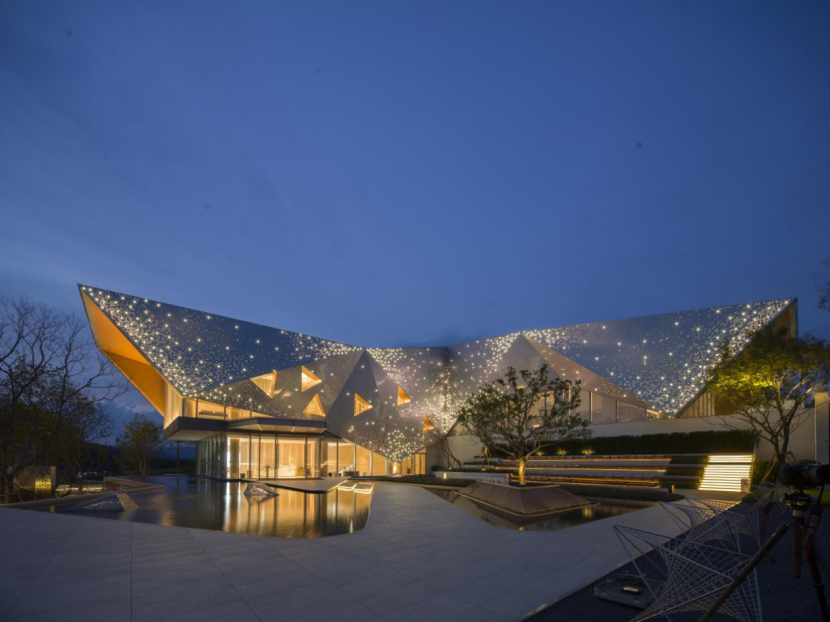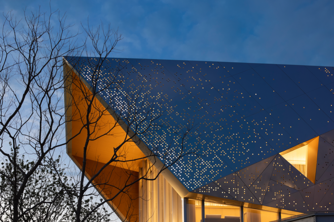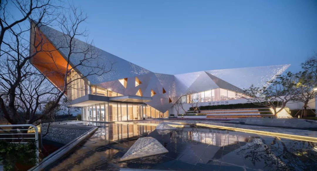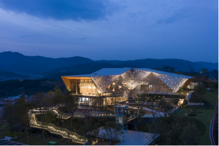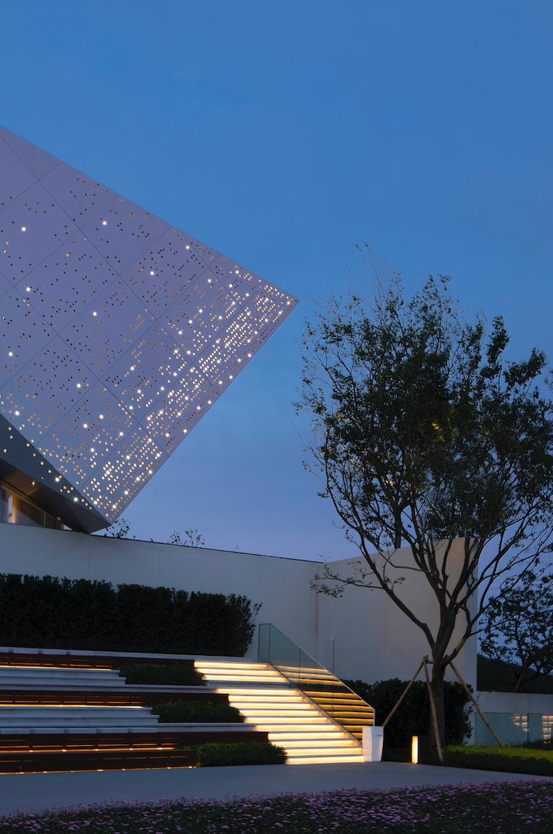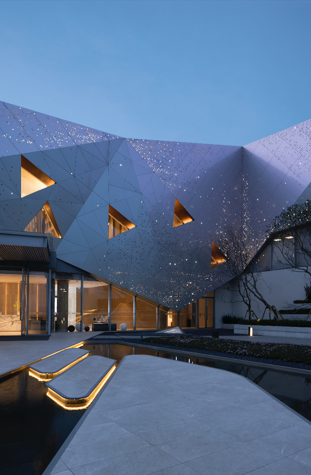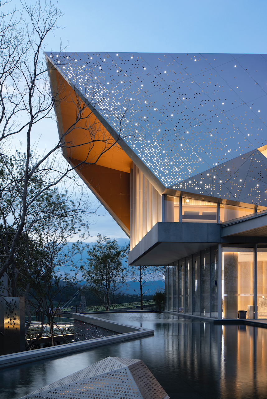 项目设计取自然、生态之美,通过设计,将建筑、景观、灯光三者融为一体,营造沉浸式的氛围感受,打造简洁大方的夜景。建筑上的穿孔,就像在星辰的指引下穿梭于山林之间,在某个瞬间,感受到宇宙的广阔,就如同整个项目带给人奇幻景象。山林里的轨迹为灵感设计了蜿蜒盘旋的扶手,加上灯光的点缀,使它们成为建筑不断延伸的光之轨迹。