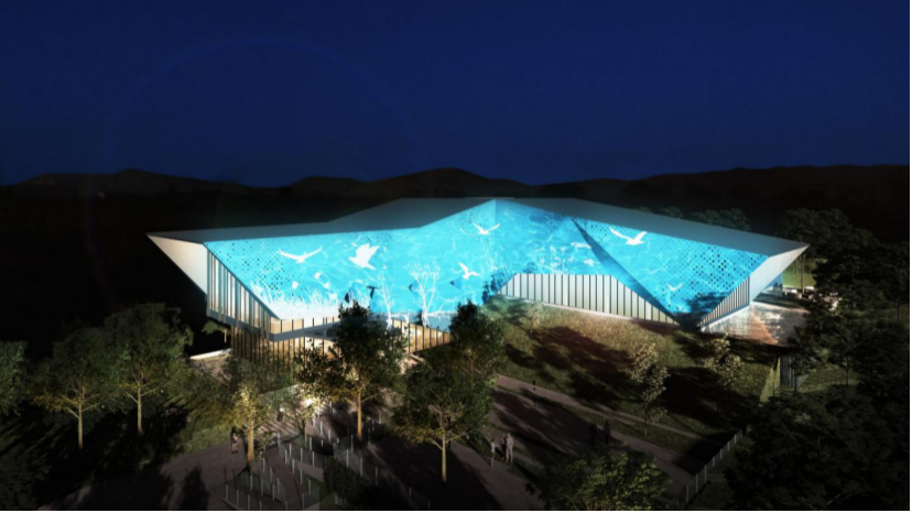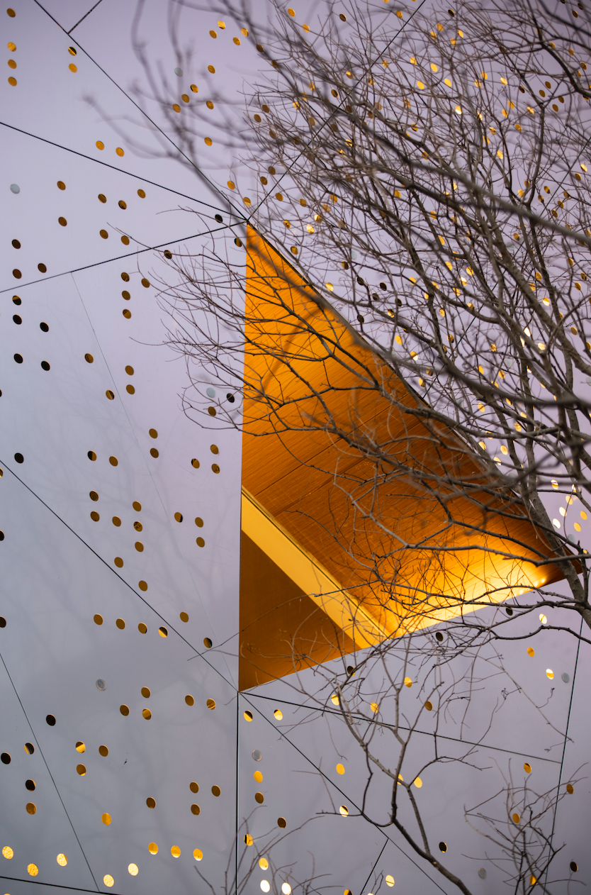 建筑立面块面转折清晰明了,幻彩铝板更加强调了光影感,通过光影控制营造随风追逐、水波荡漾、自然呼吸的灯光效果,整体节奏变化缓慢有序,节假日可呈现山林间自由的飞鸟,雨露过后的彩虹,可尽展现自然生态之光。