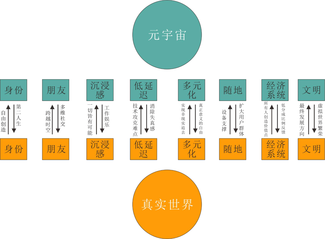 在成熟的元宇宙中,每个人都能体验到:一个虚拟身份、现实感的真人社交、可以从任何地点登录、极低的延迟、大量且多样化的内容、完整的经济系统、具有安全性和稳定性,他能在其中做任何现实生活中能做的事情,包括打游戏、去音乐会、看电影、购物,甚至是创造。