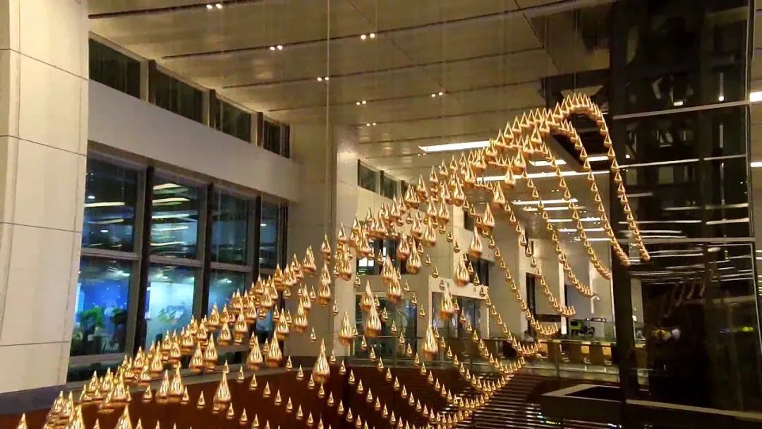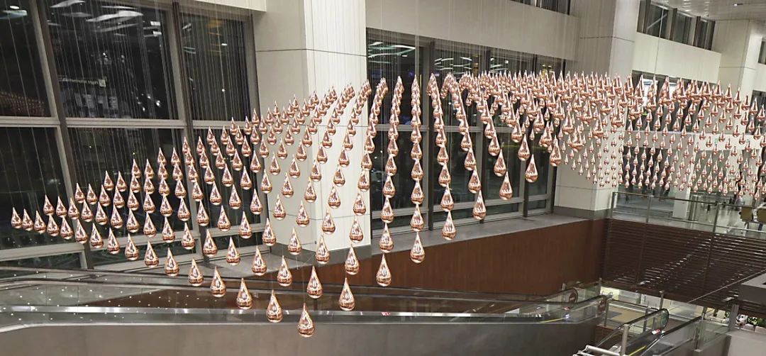 每个对称元素由 608 个镀铜铝水滴组成,这些水滴由钢丝连接到计算机控制的电机,使它们升高和降低精确。这两个元素通过 15 分钟的动画序列在对话中移动,从抽象到具象的 3-D 形式。有时零件会一致移动。在其他地方,他们互相跟随。