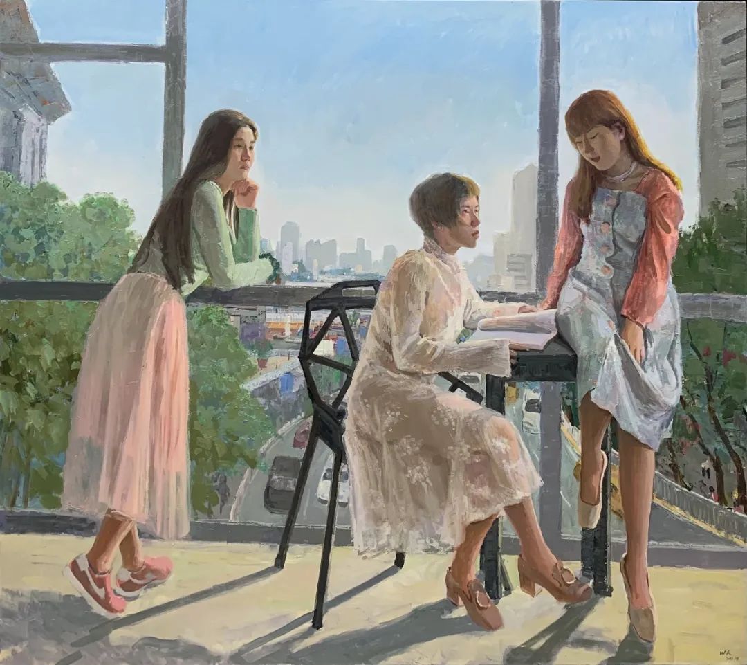 本着对西方传统绘画本体语言研究的学习方向,通过传统写实的创作手法,我的这幅作品致力于捕捉逆光下色彩的美感,营造出恬静和谐的色彩氛围。作品以人物组合为主,三位年轻女孩在现代都市背景下迎着窗外的阳光,表现安逸悠然的状态。