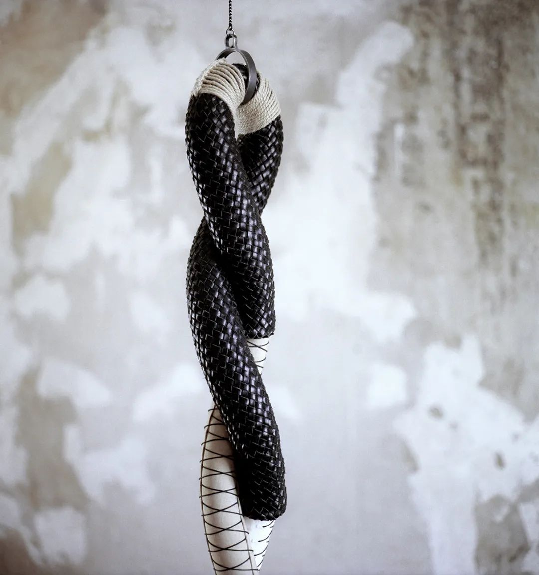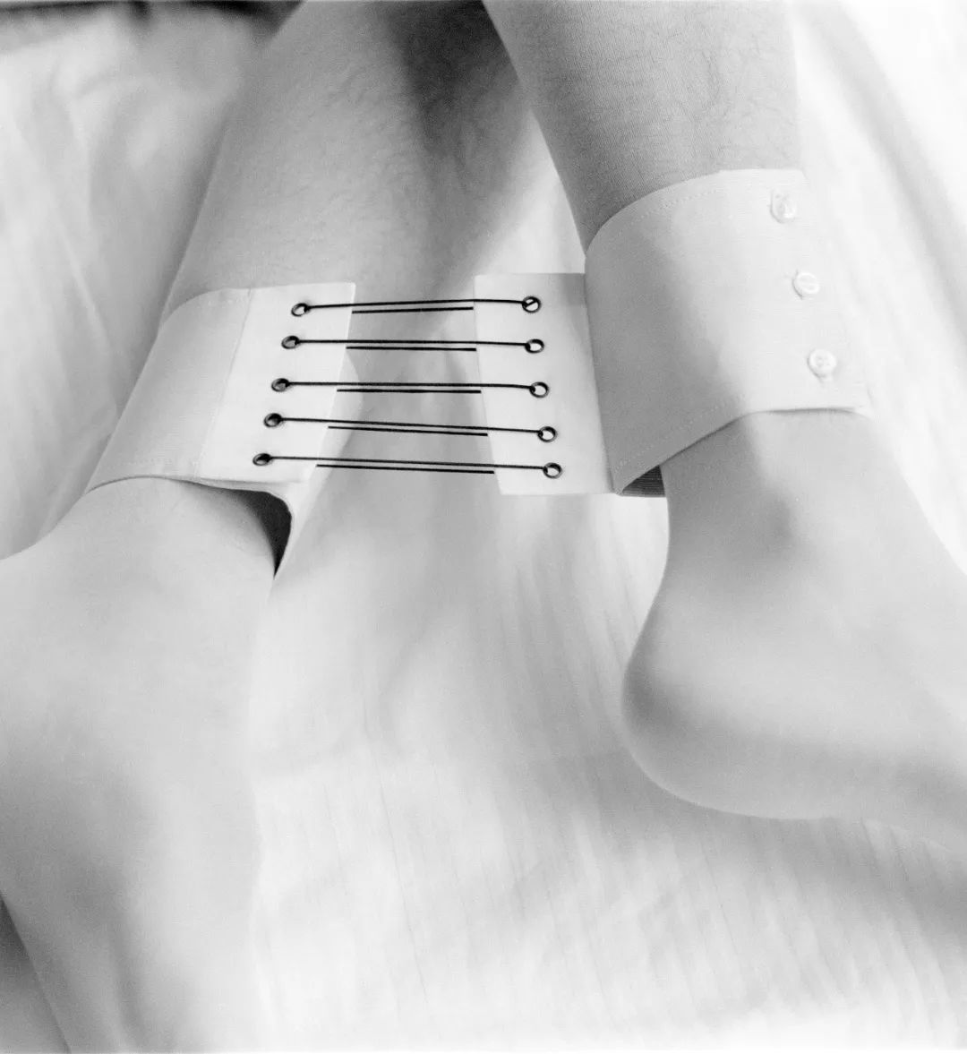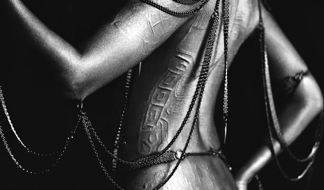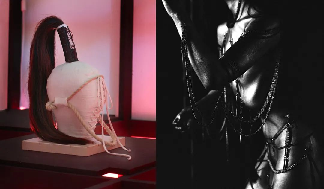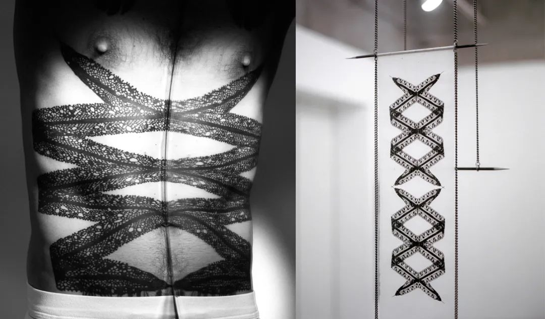 为了实现这一目标,塞林斯基借助于“身体改造”(body-modification)的方式和材料,包括穿刺、纹身、割痕、捆绑......并最终将其转换成一种独特鲜明的视觉语言。他把钢针、缎带、皮绳、链条,甚至毛发等材质归纳成具有强烈次序感的叙述——细绳以交叉或平行的方式完美排列,让人即刻联想到勒紧的束腰;与缎带同款的黑色织带对空间做了精准的标记;实心钢柱悬挂在天花板或绷在天花板与地面之间,凸显了重量;磨尖的钢针被缝合在布条中,像护阴 (caches-sex) 一样可以穿戴上身;由真皮和麻绳缝制的加长“阳具”吊在空中,有种让人想要触碰的悸动。塞林斯基的四肢布满了纹身,整个躯干被黑色的蕾丝和蛇皮花纹覆盖,这个纹身不断重复,给人一种难以名状的、慑人的美。对于他而言,这些材料附属物不仅是身体的延展和自我情感的投射,更是感受痛苦与欢愉的一个外力。