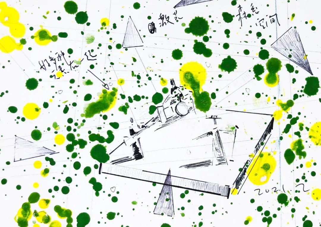 这一期,我们特别邀请《草莓星球来的人》舞美设计总监徐海东、舞美制作总监刘祺,聊聊三大舞台的设计逻辑、星球舞美的时代思考:“最初在选景的时候,用了环境戏剧和电影的逻辑。我们希望找到一个不一样的‘地方’。我们心里都很清楚,希望给音乐人的是什么。但这个‘地方’,你得看到才行。”徐海东介绍。打造一档节目,打造一个世界观。如何承载草莓星球的世界观?他们在无意中遇到一处天台,徐海东将之形容为“意外之喜”:“它(天台)其实是长隆里原本存在的一个建筑结构,但这个结构的视觉空间刚好能承载我们希望给予音乐人的东西,或者说正好就像节目所命题的‘草莓星球’的感觉。这是‘偶得’,却又非常愉悦。”对标音乐人成长阶段之初的“小”舞台,天台舞台保有着初生、粗粝的感觉。这里原始又未来,分割却统一。负责舞美制作的北京美乐克文化发展有限公司团队在现场铺设草地,增添设施。“就像刚刚降落在草莓星球,大家围坐在天台玩耍的感觉。”刘祺说,“这里的气质正好与节目设定的玩法所吻合,与节目第一阶段的氛围相融合。”节目来到无限抢番BATTLE的环节,乐迷为喜欢的乐队能否留下捏足一把汗。在BATTLE舞台的设计上,徐海东希望传递的信息是,两组音乐人,既在对抗,也在陪伴:“在BATTLE舞台,我没有设计特别强烈的对抗感。反而是使用了‘碎片’的语言,两组音乐人在碎片上共同承载。”而BATTLE舞台最大的优势,是长隆剧院的大屏和优秀的纵深。“我们是在长隆剧院的基础上进行改造,”刘祺介绍,“搭建了舞台和碎片化的结构。剧院那块巨大的屏幕,为舞美在内容呈现上丰富了许多。碎片化结构结合灯光效果生出更多的可能性,在这样一个特定空间里,能给到观众更多不一样的感受。”在自我否定了多版手稿、陷入某种胶着的时候,英国艺术家大卫·霍克尼的“泳池”美学成为徐海东对于公演舞台设计方向的一个出口。那种清凉、自由、开放、明艳、流动的美感,似乎正是《草莓星球来的人》想要展示的调性。捕捉着这丝灵感,他马上手绘了新的草图。“总导演看了后拍板说,对了!这张是对的。我们都非常兴奋,马上着手考虑可行性、需要的技术手段。”徐海东说。他将现场设计为四面环绕的舞台:正面是新血音乐人表演舞台;对面是安可团坐席;左右两面则设有音乐人坐席以及观众站立区。而被四面包围着的,则是“泳池”——观众观演的主要区域。抽象意义的“泳池”,与摇滚概念的“跳水”,形成了有趣的互文。