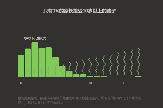 上图是一个模拟了一个 2 岁儿童被收养的过程,如果孩子的情况和父母的偏好能够匹配就会被收养。经过模拟比对,一个 2 岁、身体健康且有兄弟的黑人小孩会在一周内被人领养,而一个 10 岁的孩子则需要一年或者更长的时间。