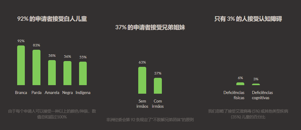 在巴西,年纪较小的独生白人女孩最受想要收养孩子的父母喜欢,但是一个有兄弟姐妹的 14 岁黑人男孩,是可供收养儿童中最常见的情况。根据巴西官方的模拟,一年之内 14 岁男孩被收养的几率为千分之一,而女孩被收养的几率远远高于男孩。而除了父母的喜好和孩子自身的情况外,儿童法庭的审判也关系到孩子是否会被领养。巴西官方制作了一款全国收养系统 (SNA) 开始巴西各地推广。