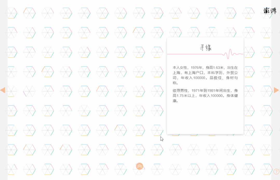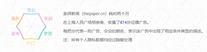 澎湃美数课是澎湃新闻旗下的数据新闻栏目,数据新闻又被称作“数据驱动新闻”,是全球新闻业在大数据时代的发展变革中所做出的一种尝试,是未来新闻业最重要的发展方向。2018 年,澎湃新闻在上海人民广场相亲角收集了 874 份相亲广告,制作出一份《转角遇到爱》的上海相亲市场的数据可视化报告,让我们一起来看看。