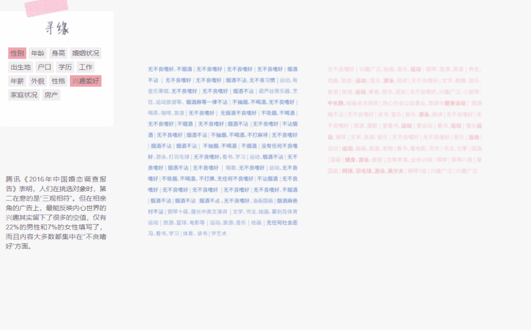 统计相亲广告上的各个内容,对每一个信息进行脱敏处理,以动态数据可视化的方式每一个数据。
