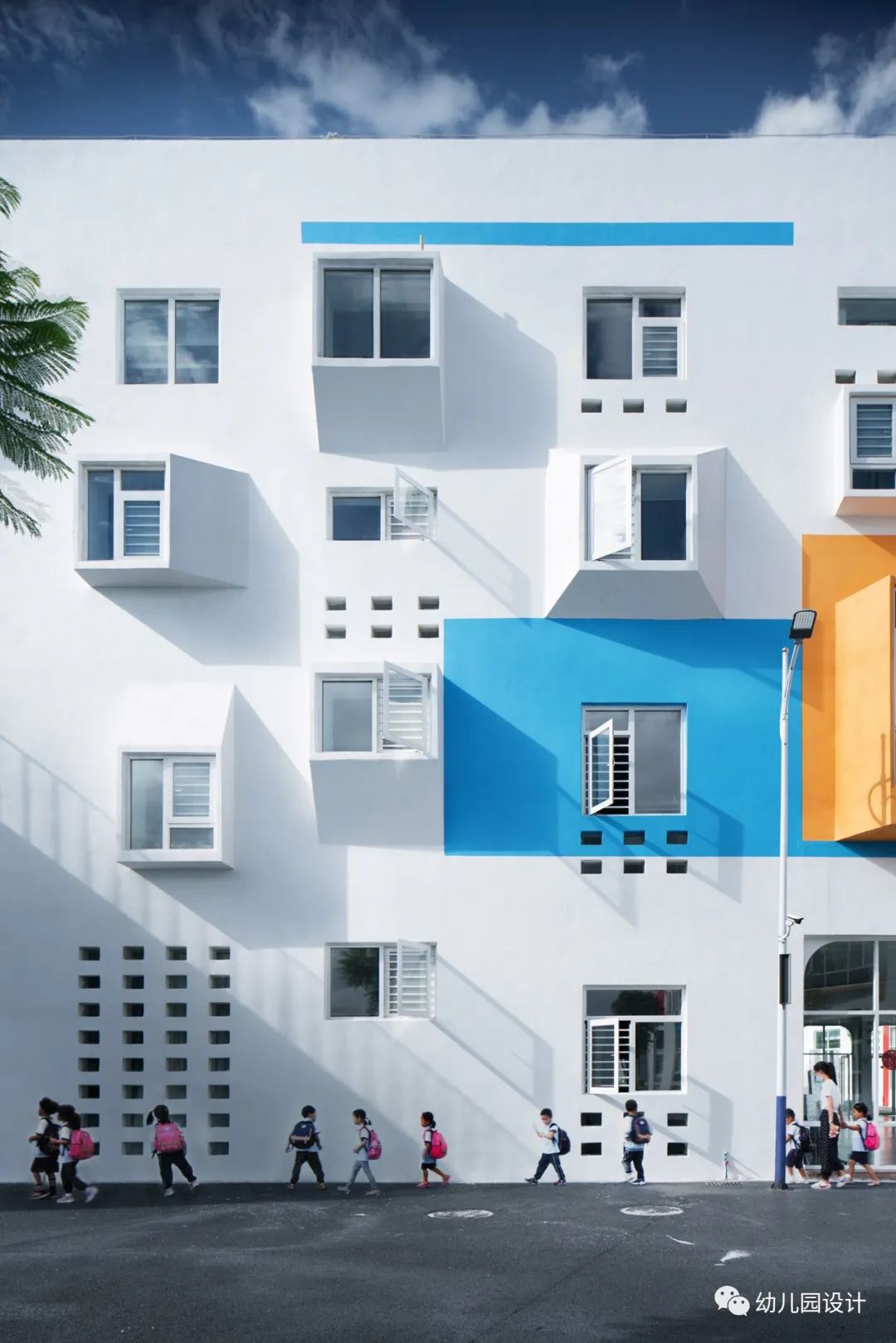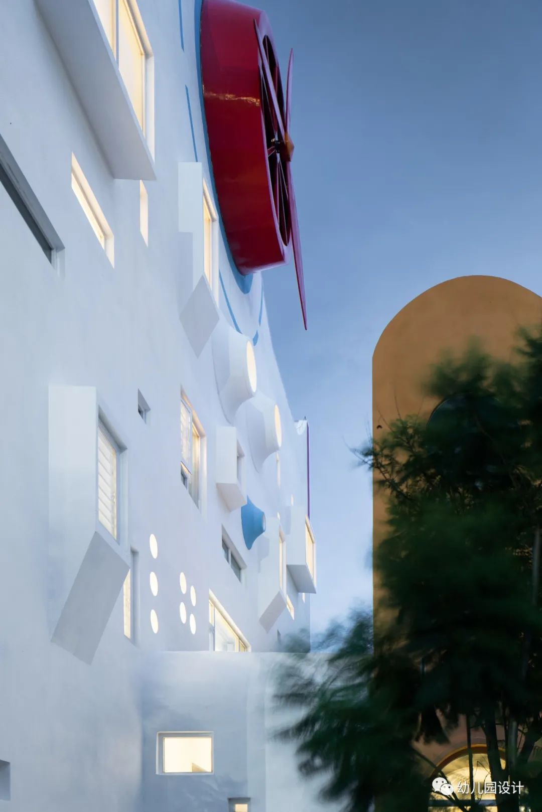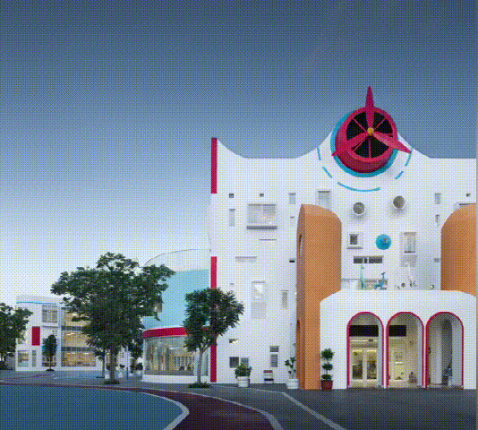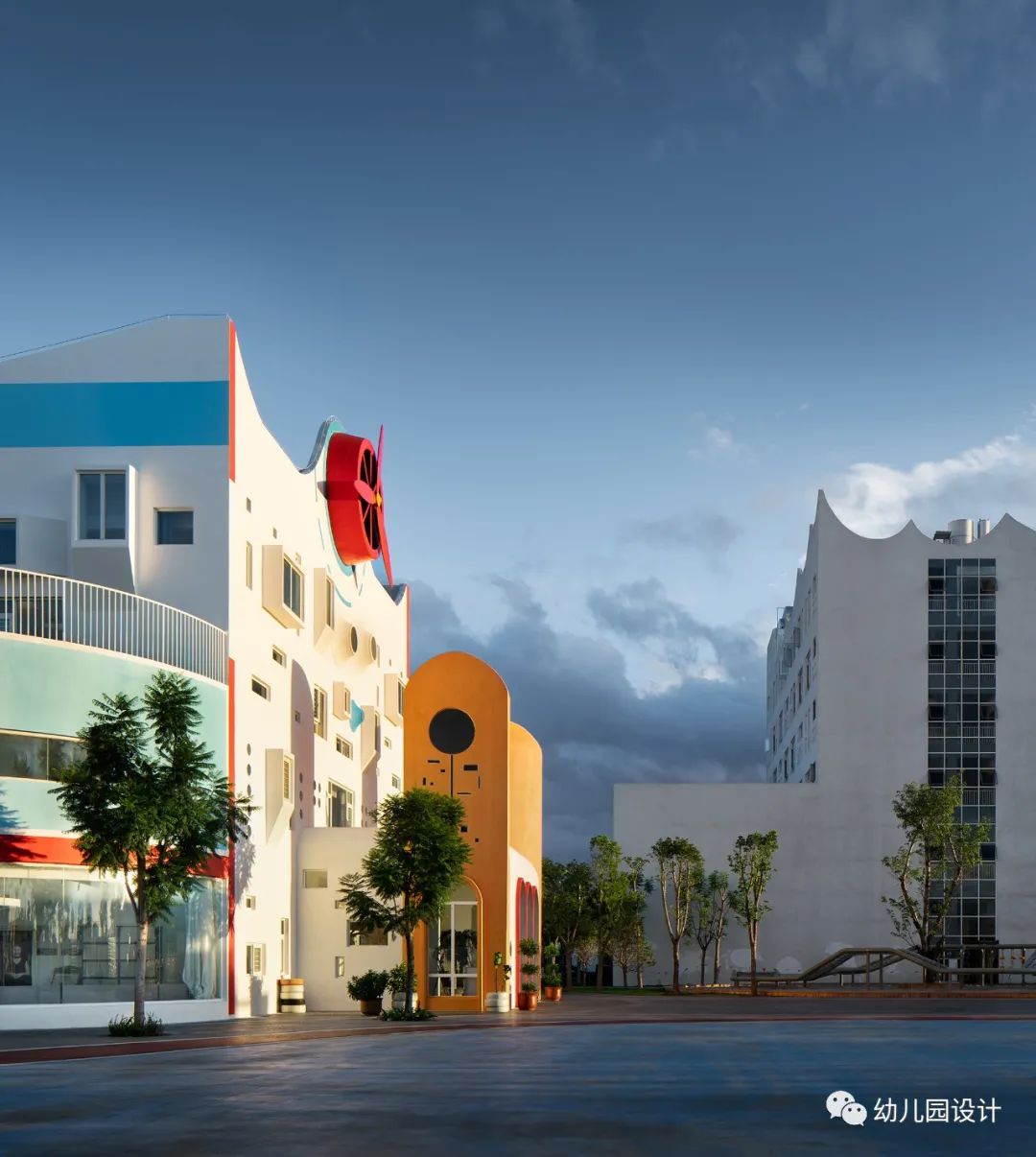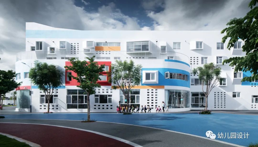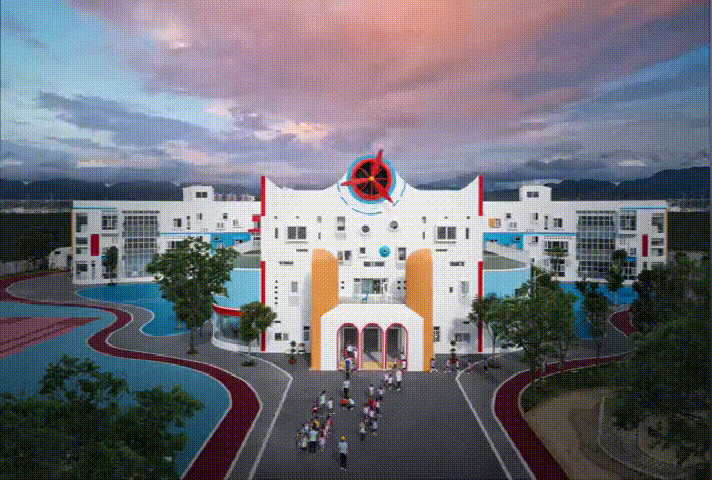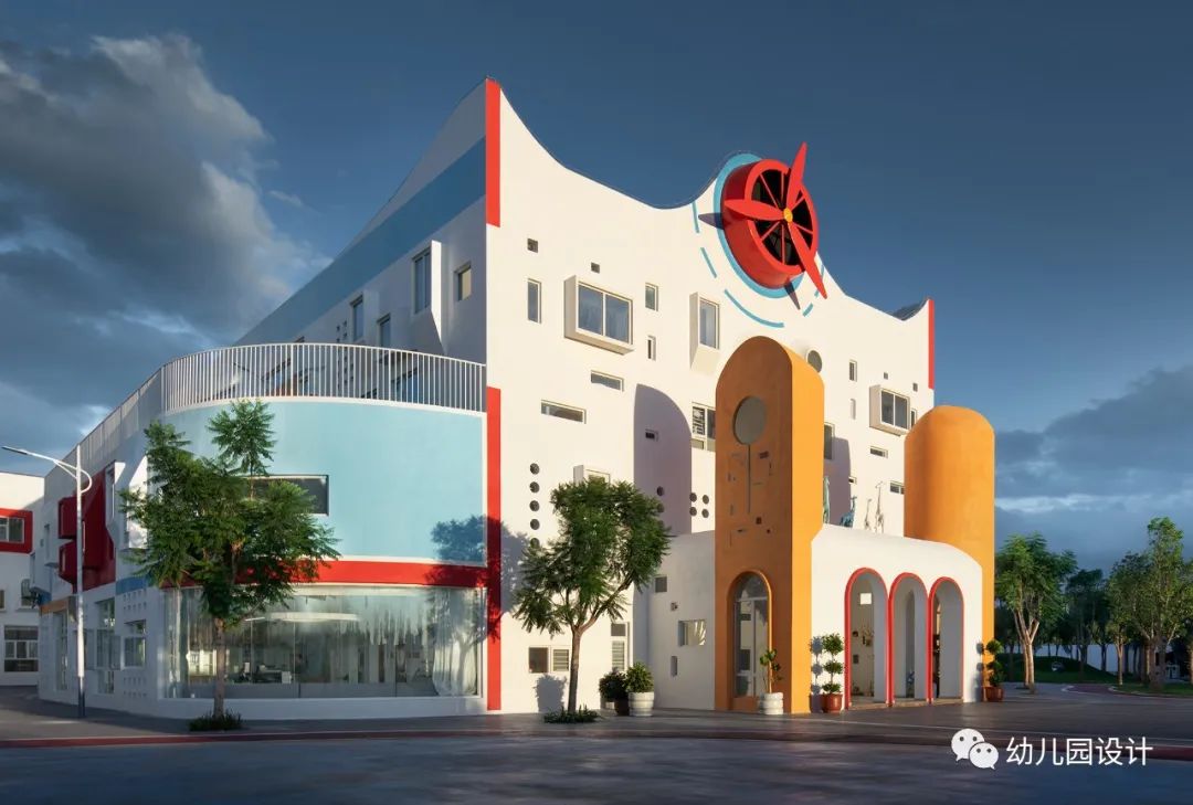 从童年记忆出发,设计师找寻到每个人童年记忆中都有的纸飞机,设计出了“纸飞机幼儿园”,因为孩子的趣味世界是最富有共通性的,“纸飞机”的螺旋桨也成为此幼儿园的标志物,简单又醒目,孩子们每天经过,引导孩子们走进园所大堂,给了孩子们在游览学习中有了明确清晰的方向指示,当螺旋桨转动的时候,幼儿园仿佛活了起来,孩子们好奇而欢快,进入一个不真实又很真实的世界。