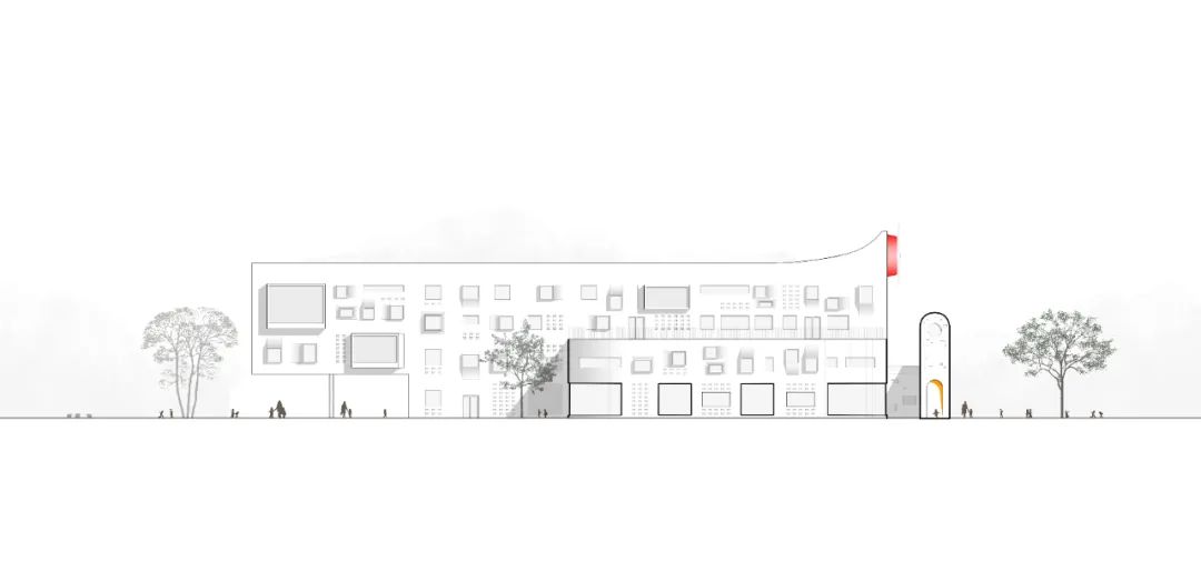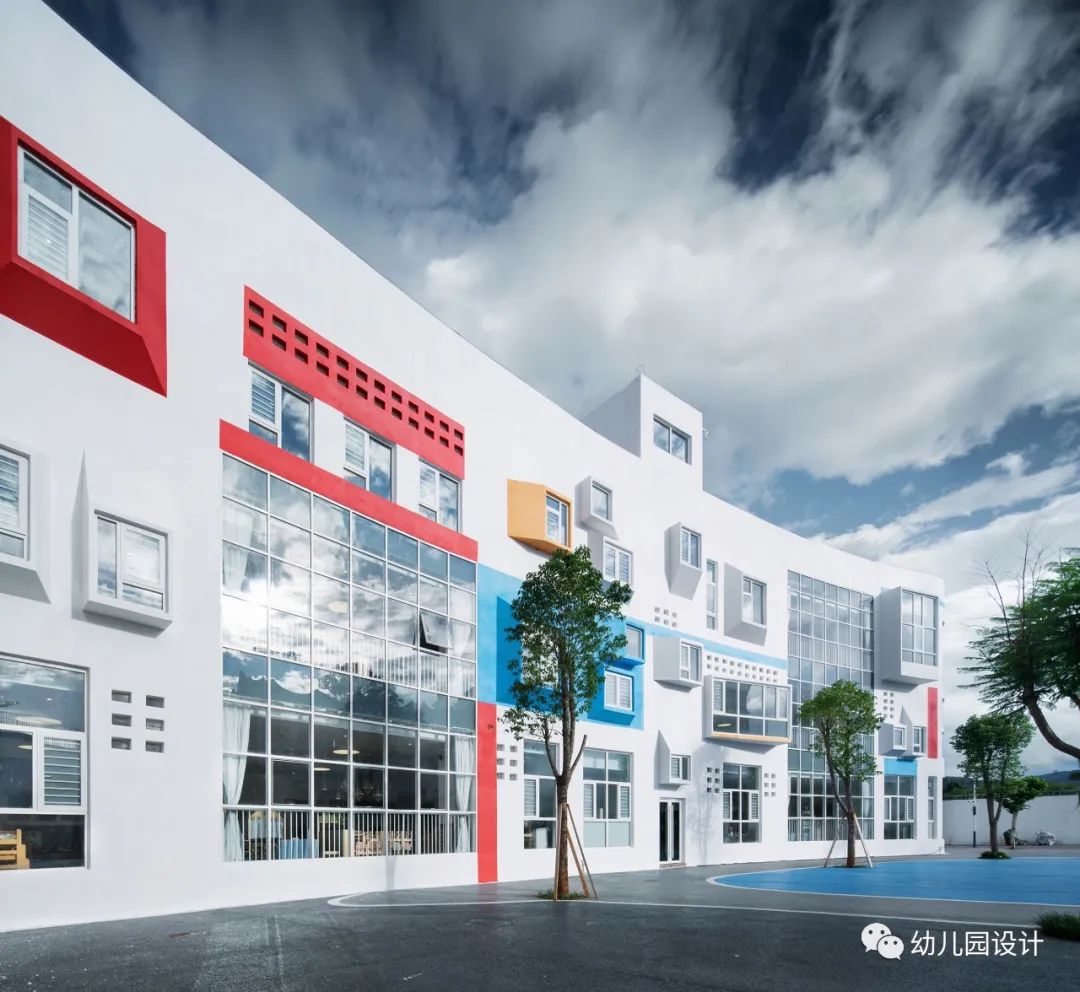 建筑侧外观,部分立方体块被移除或放大,大窗确保了室内的自然采光和景观视野,使自然光可以自然的照射进室内,孩子在玩耍之间,转眼便见窗外的绿植,在这里生活和学习的老师与孩子们,也将在这个全新的公共空间中,通过时间的积淀,见证着每一步成长,形成不一样且独特的校园文化氛围