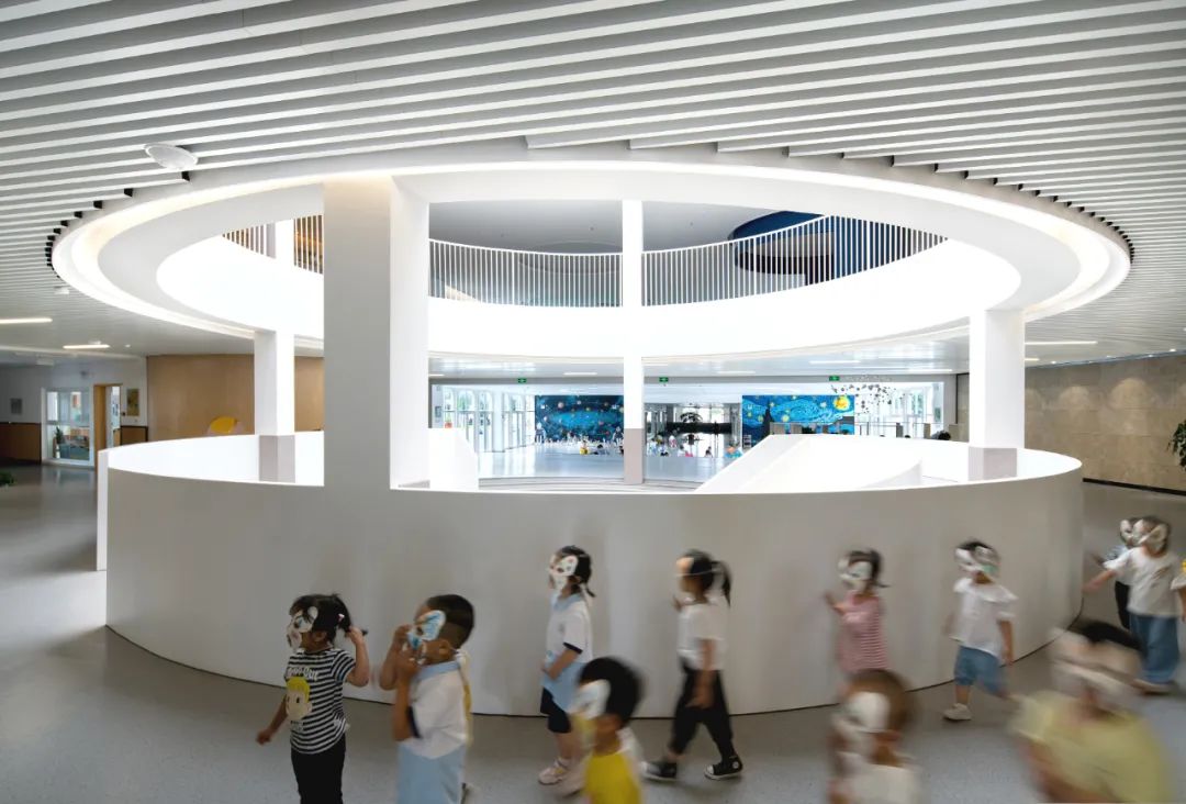 采光中庭打破了地下空间的刻板认知,自上而下串联起幼儿园内部的各层空间,每天各个时间的光照都能让天井这里的阳光延伸至不同的教学场所和位置,墙体白色的运用让这一效果显得更为纯粹,为孩子带来连续的、沉浸式的体验,实现思想“交流”的最大化。
